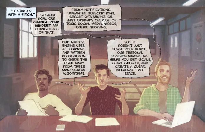 I don’t think it would’ve been the same to start him already established and see them pivot. I feel like it needed to be a rags to riches, a startup. You had to see where Ben was feeling like he had nothing and understanding and relating to not only that but his ideals to do something positive with technology. I think that first pitch meeting he has in that very first issue where he’s pitching to Winfield and all of these tech moguls and he’s saying I just want to do something that will help people. And they’re saying that’s not how this works. We need you to use the data, or get some celebrity voices, or this or that. Why can’t it just be helpful?