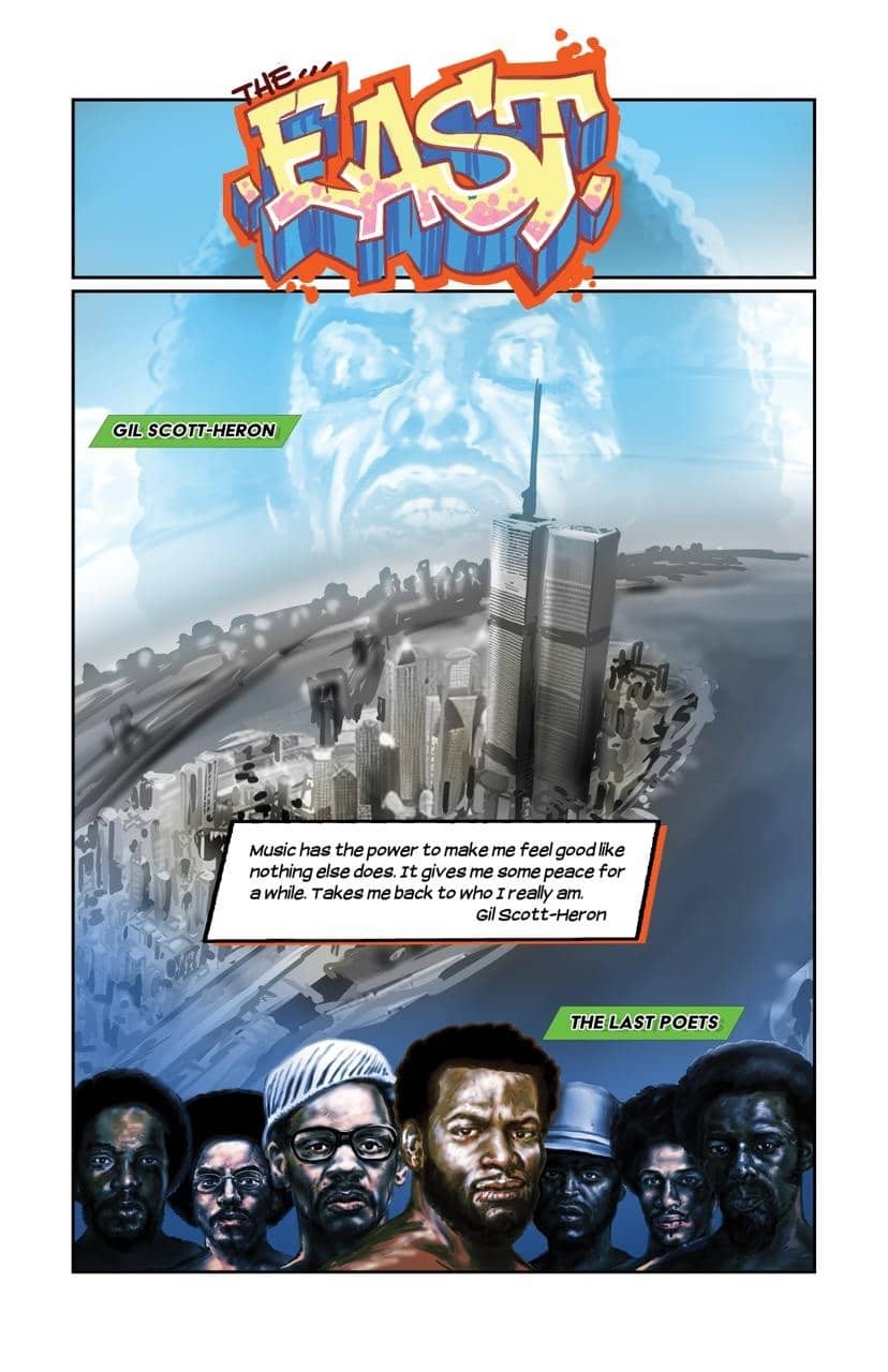 Greason: You’re absolutely right. It is not a paint-by-numbers text, there are layers on top of layers of meaning, character, and sacrifice that are built into each page and every panel. You can study it for years and never stop finding all of the easter eggs and hidden meanings and the way that it all fits together. For me as an educator, that’s the key to growing people’s curiosity about a subject and we tap into something people feel familiar with. They all have memories of Hip Hop, songs they love, and artists they appreciate, in ways that it’s kind of marked moments in their lives. People use Hip Hop songs for weddings, funerals, and the births of their children. In this piece of Hip Hop, what I’m able to do is place it in a larger historical context. People see their lives in a different light, but at the same time, it feels intimate and familiar. And doing that, playing into the genius of Tim Fielder’s art, the way people connect with their artists in a deep and intimate way as they look at each page, it’s just a beautiful experience, and it’s what makes the readers all respond so positively. It’s that this isn’t just my voice or Tim’s, it’s their own voices that are being affirmed as a result.