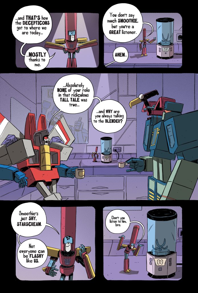 Brian “Smitty” Smith: I think he is confident to a fault but he does possess some level of empathy. For instance, his best is the blender in the breakroom in our story thinking that the blender is an actual Transformer but it’s not. He just thinks he’s very quiet. A lot of the book is about him being humbled and learning humility as part of his journey. I definitely wanted him at a starting point where he’s firmly a Decepticon and thinks he’s the baddest of them all. He thinks everyone loves him. But he quickly gets a reality check on all fronts.