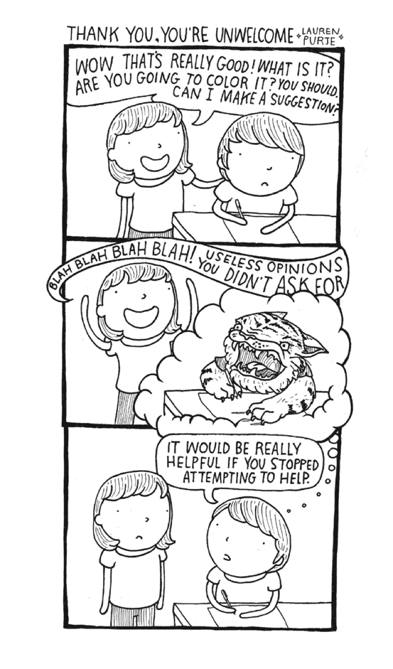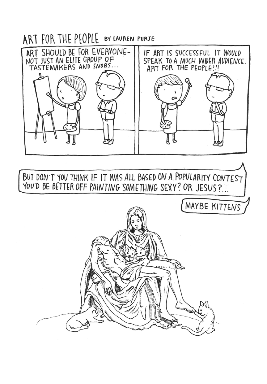Lauren Purje studied fine art, but in recent years she’s best known for making comics about the art world – most importantly about what it means to be an artist, especially a young artist. Her comics sometimes feel like editorials on the state of the art world, others come off like self-help and self-care, while still others are funny anecdotes containing absurdities that some will find over the top and others will consider all too realistic. Any creative minded person will find her work very relatable – sometimes maybe too relatable!