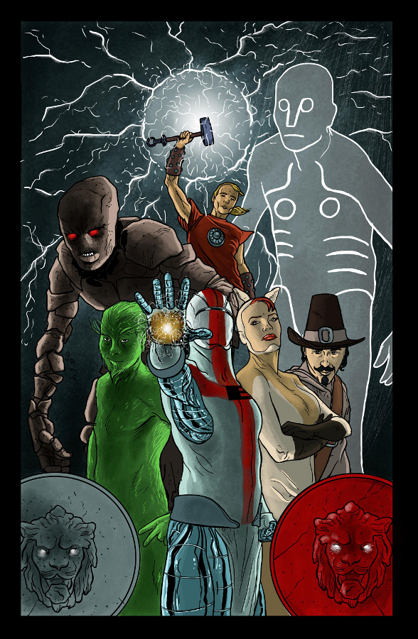 Joining him on the cover promo art we have: a rather skinny Thor-lite, perhaps representing England’s pagan past; a moss-man named Greenbelt, quite possibly the scourge of city planners everywhere; Dry Stone Wall, named for the UK’s err, numerous ancient walls; a sultry woman with what looks like… bunny ears? (possibly either the Easter/fertility bunny or a Tinners’ Hare); a dude who looks suspiciously like Guy Fawkes, our celebrated failure of a terrorist; and finally what looks like a sentient version of the Cerne Abbas Giant chalk hill figure, minus his gigantic and upstanding dong.