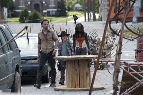 Arriving at the town, they find it booby trapped, animals in cages luring zombies into spikes, warning messages scrawled everywhere. Rick’s old police station is stripped of guns, but they set off to find if some weapons might have been stashed in bars or stores. Suddenly the owner of the traps appears on a rooftop, covered in armor, as faceless as the hitchhiker they left behind, but this time he’s the one protecting his territory. After some gunplay, Carl, who was supposed to be safe in the car, appears and calmly shoots the mystery man, who is wearing body armor and just knocked unconscious.