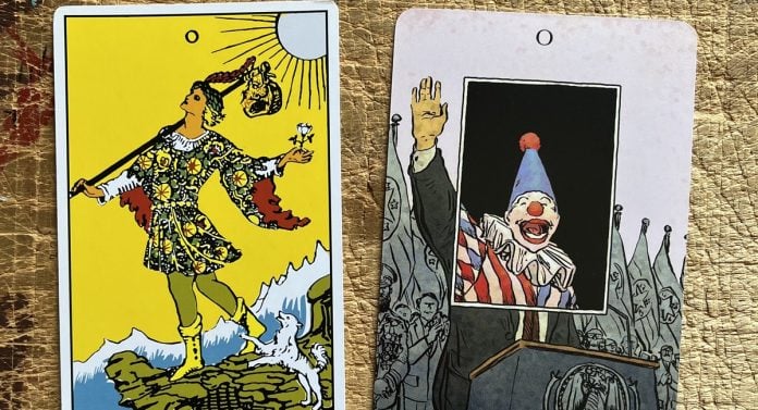 On The Fool: This was the card that got me the contract to do a whole deck. I’d been drawing tarot cards at a leisurely pace and without much intention, maybe I’d draw all of the major arcana, or maybe not. But when I posted this card online, it got a lot of comments and retweets, and all of that. Some people praised it for mocking Trump, others for mocking Biden, others shamed me for being a kneejerk liberal. With the relation to the tarot, some people said it was the best interpretation of the card, and some said it was the worst, that I was totally missing the point. It unintentionally had all the things that feed an algorithm, which got it in front of the right people’s eyes. In some ways, it defined some of the rules for how the deck would work. It breaks from the more standard card composition and symbolism, which became one of the ways the deck is distinct. Ironically, I don’t think I would have drawn this card this way after I signed the contract. Once that happened, everything became sort of official, and I think with that, I lost some of the looseness that this card came out of.