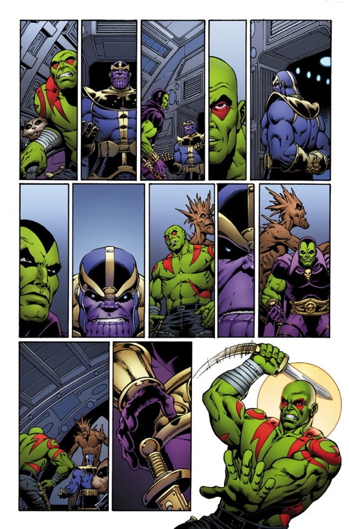 That Drax page is a reminder that Starlin’s still got it. No text but communicates perfectly (using flashes of Drax’s old costume) that the reborn Jax still has the drive to kill Thanos that was the whole point of his original existence.