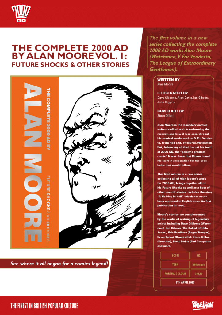 Alan Moore is a legendary comics writer credited with transforming the medium and how it was seen through his seminal works such as V For Vendetta, From Hell and, of course, Watchmen. But, before any of that, he cut his teeth at 2000 AD, the “galaxy’s greatest comic”. It was there that Moore honed his craft in preparation for the accolades that would follow. This first volume in a new series collecting all of Alan Moore’s work for 2000 AD, brings together all of his Future Shocks as well as a host of other one-off stories. Moore is a master of the short-format story and this collection doubles as the perfect guide for how to write comics to a page limit. Includes the story “A Holiday In Hell” which has never been reprinted in English since its first publication in 1980. Moore’s stories are complemented by the works of a string of legendary artists including Dave Gibbons (Watchmen), Ian Gibson (The Ballad of Halo Jones), Eric Bradbury (Rogue Trooper), Bryan Talbot (Grandville), Steve Dillon (Preacher), Brett Ewins (Bad Company) and more.