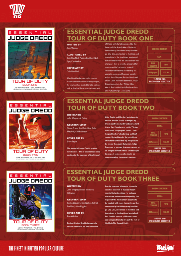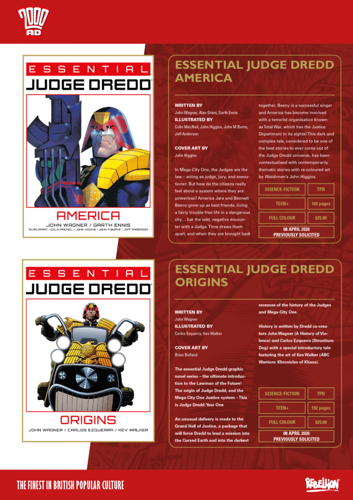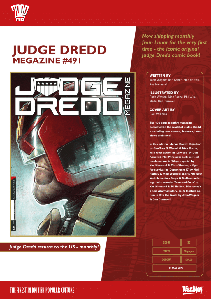 Our 100-page monthly anthology brings readers into the future-shocked world of Judge Dredd with ‘Judge Dredd: Rojimbo’ by Geoffrey D. Wessel & Nick Roche; wild west action in ‘Lawless’ by Dan Abnett & Phil Winslade; dark political machinations in ‘Megatropolis’ by Ken Niemand & Chris Weston; a fight for survival in ‘Department K’ by Ned Hartley & Mike Walters; and 1970s New York detectives Fargo & McBane making their return in ‘Favoured Sons’ by Ken Niemand & PJ Holden. Plus there’s a new Atomfall story, sci-fi football action in Rok the World by John Wagner & Dan Cornwell, features, interviews and lots more!