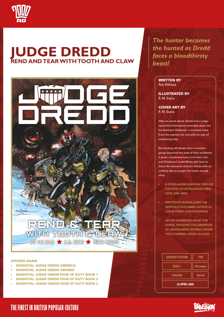 After an aerial attack, Dredd and a judge squad find themselves stranded deep into the Northern Radlands, a hundred miles from the nearest city and with no way of contacting help. But fending off attacks from mountain gangs becomes the least of their problems: a great, murderous bear is on their trail, and Dredd and Cadet Moon will have to brave the elements and join forces with an unlikely ally to escape the frozen woods alive.