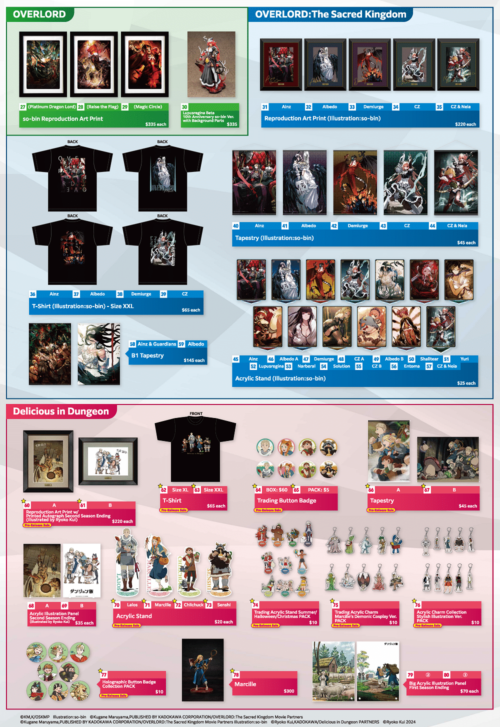 Exclusive T-Shirts featuring illustrations by artists like Ryoko Kui (Delicious in Dungeon) and so-bin (OVERLORD).