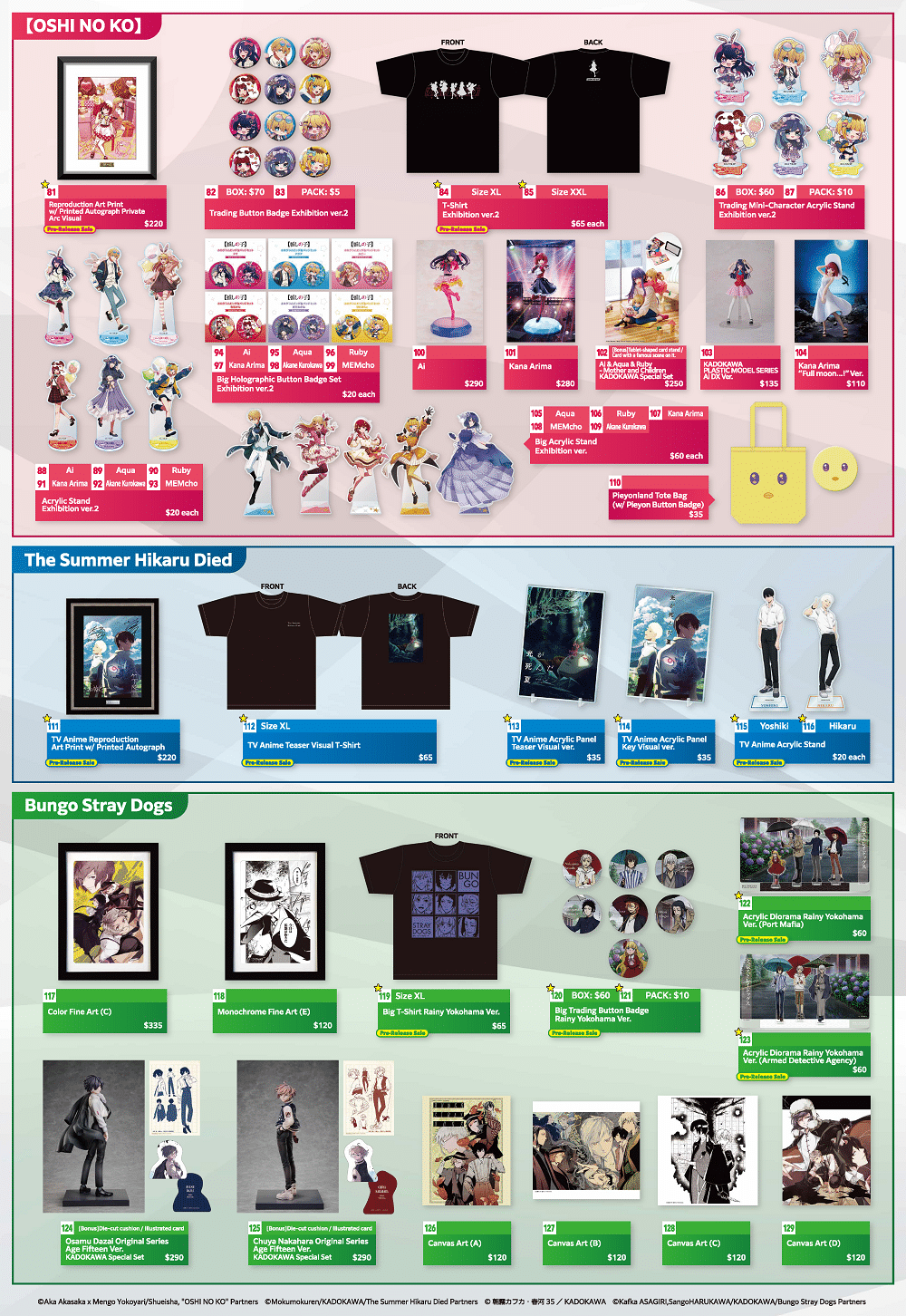 Fans attending Anime Expo can expect limited-edition items from hit series like Re:ZERO -Starting Life in Another World-, Delicious in Dungeon, Bungo Stray Dogs, 【OSHI NO KO】, Panty & Stocking with Garterbelt, The Summer Hikaru Died, OVERLORD: The Sacred Kingdom, and Alya Sometimes Hides Her Feelings in Russian.