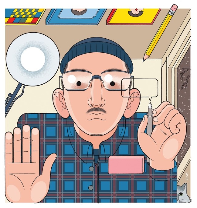 Drnaso’s portrait was a drawing by his friend Chris Ware, but if you want to see a photo, it’s in this Italian interview. Bonus: GIANT CAT and I’m not kidding!