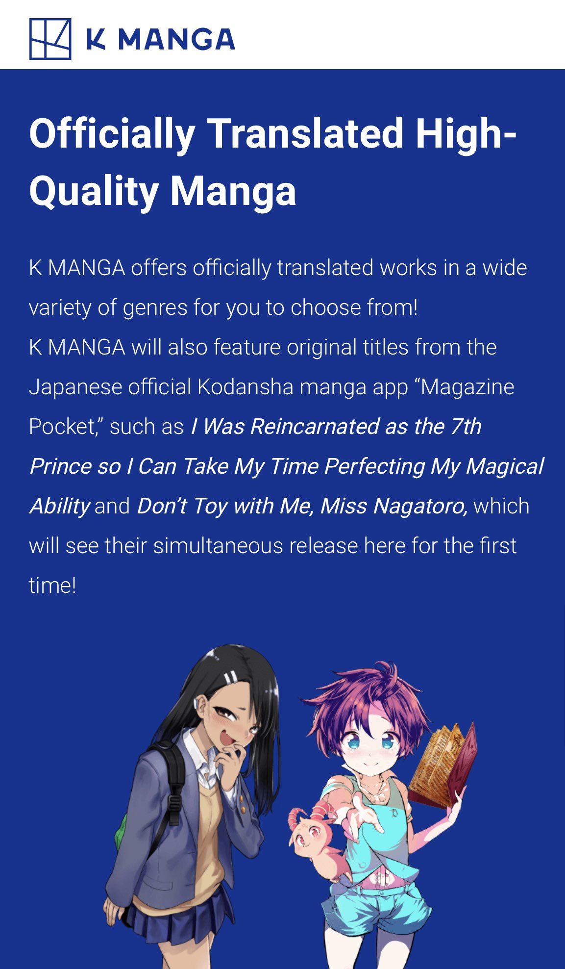 UPDATE: The K Manga teaser website provided more information about what “K Manga Original titles” might mean, as it refers to simulpub chapters of series currently featured on Kodansha’s Magazine Pocket app / website, including Don’t Toy With Me, Miss Nagatoro and I Was Reincarnated as the 7th Prince so I can Take My Time Perfecting My Magical Ability.