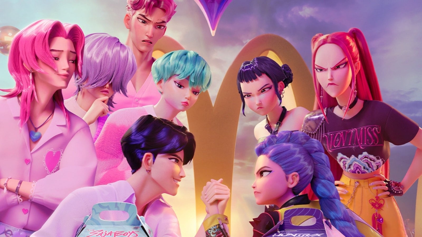 After breakfast, they can pick up the HUNTR/X Meal, which includes 10-piece Chicken McNuggets and a medium soft drink, as well as three limited-time menu items: Ramyeon Shaker Fries with a soy, garlic, sesame, and spice seasoning; sweet chili Hunter Sauce; and hot mustard purple Demon Sauce.