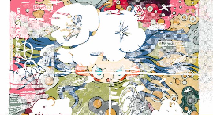 The molecular spectacular on display in Mother is the microbe world, equal parts scientifically accurate and 1930s cartoon balloon art. So Adventure Time looking little dudes, but against a backdrop of color patterns that resemble a Persian carpet. Abs Bailey uses a lot of beautiful, constructed imagery throughout the book, raising the bad parent out of their filthy apartment, suspended in the center of an ornate visual motif. Like Alabaster Pizzo or Ron Rege Jr‘s mix of clearly planned and freely executed, party people with an abyss instead of a good side (see also the comics of Grayson Bear). Art less eerie and more absurd than Dream Machine. But the story every bit as saturated with gloom and black humor.
