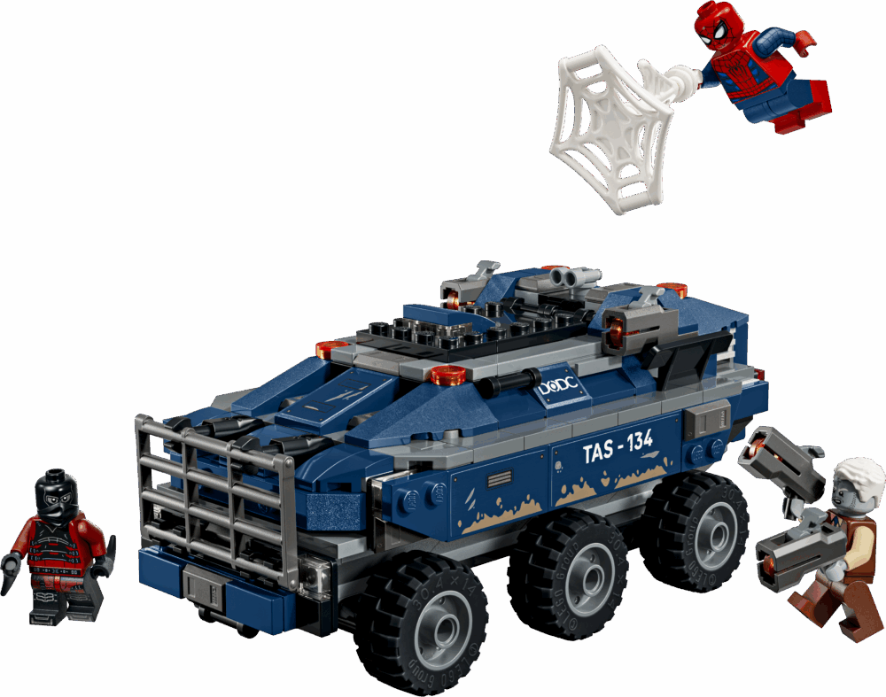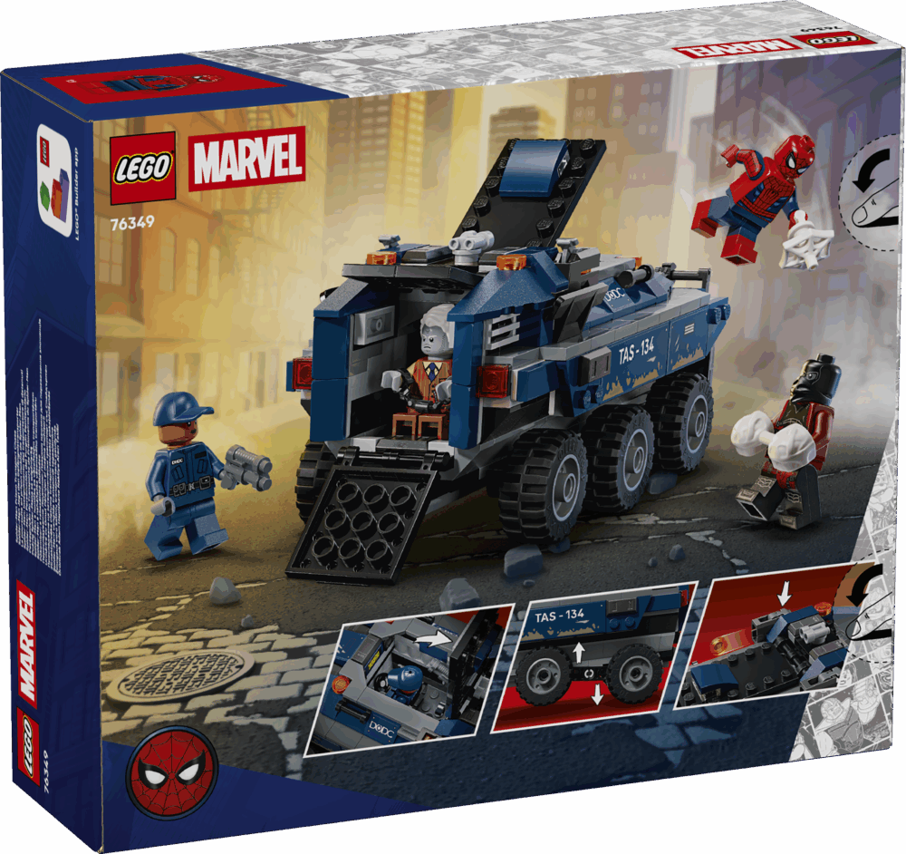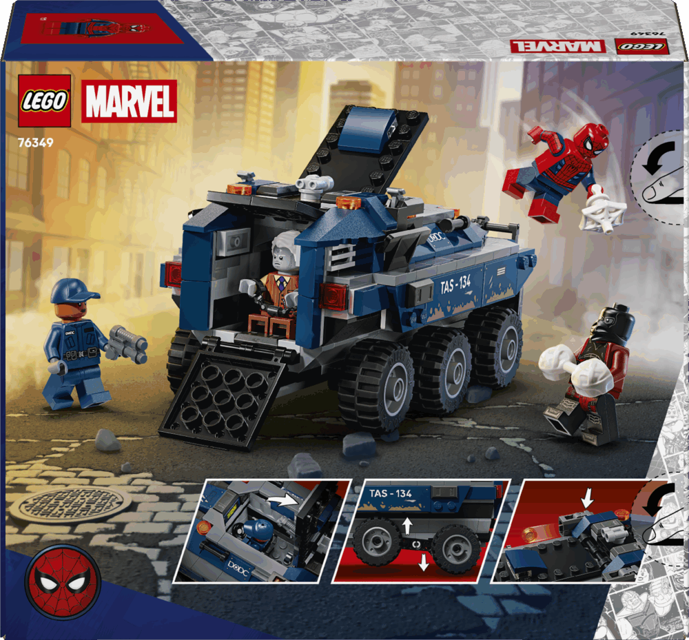 Leap in the cockpit, then race into action with Spider-Man in the mega, 6-wheel prison transporter as you chase down Tombstone and Tarantula! Sling webs, dodge stud blasts and lock the villains in the on-board prison – until their next escape attempt!