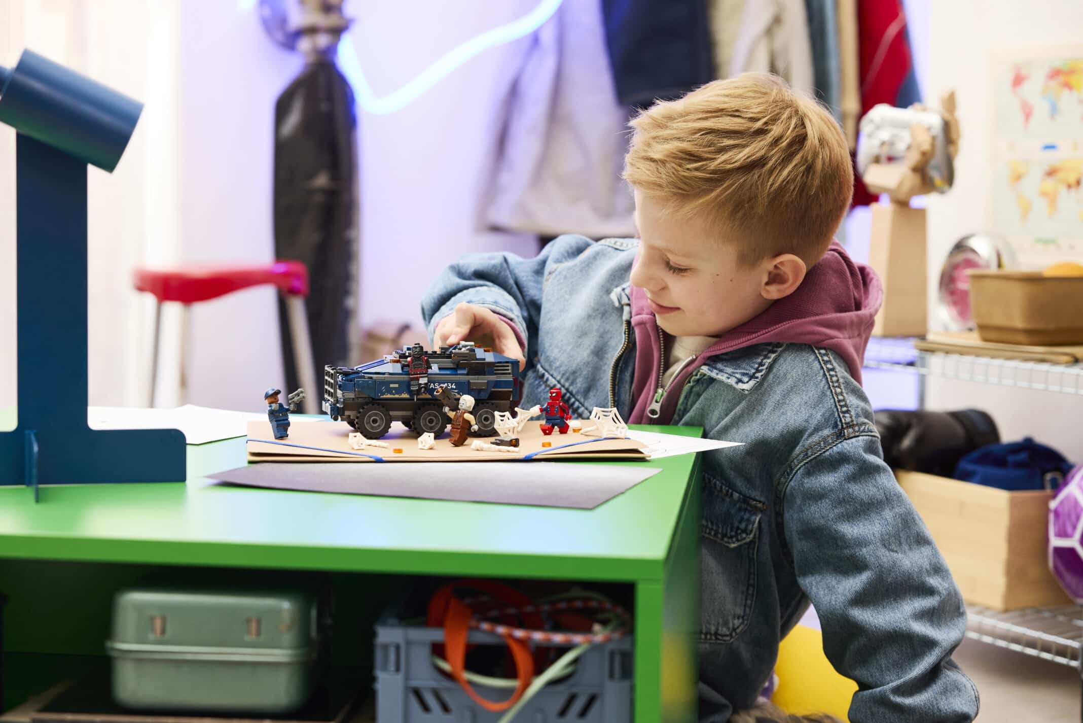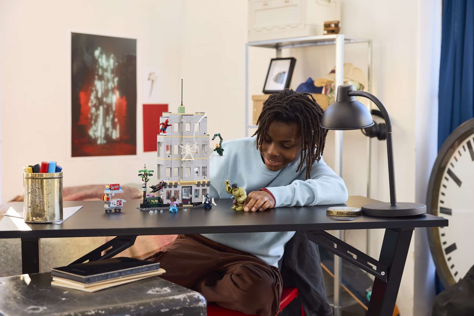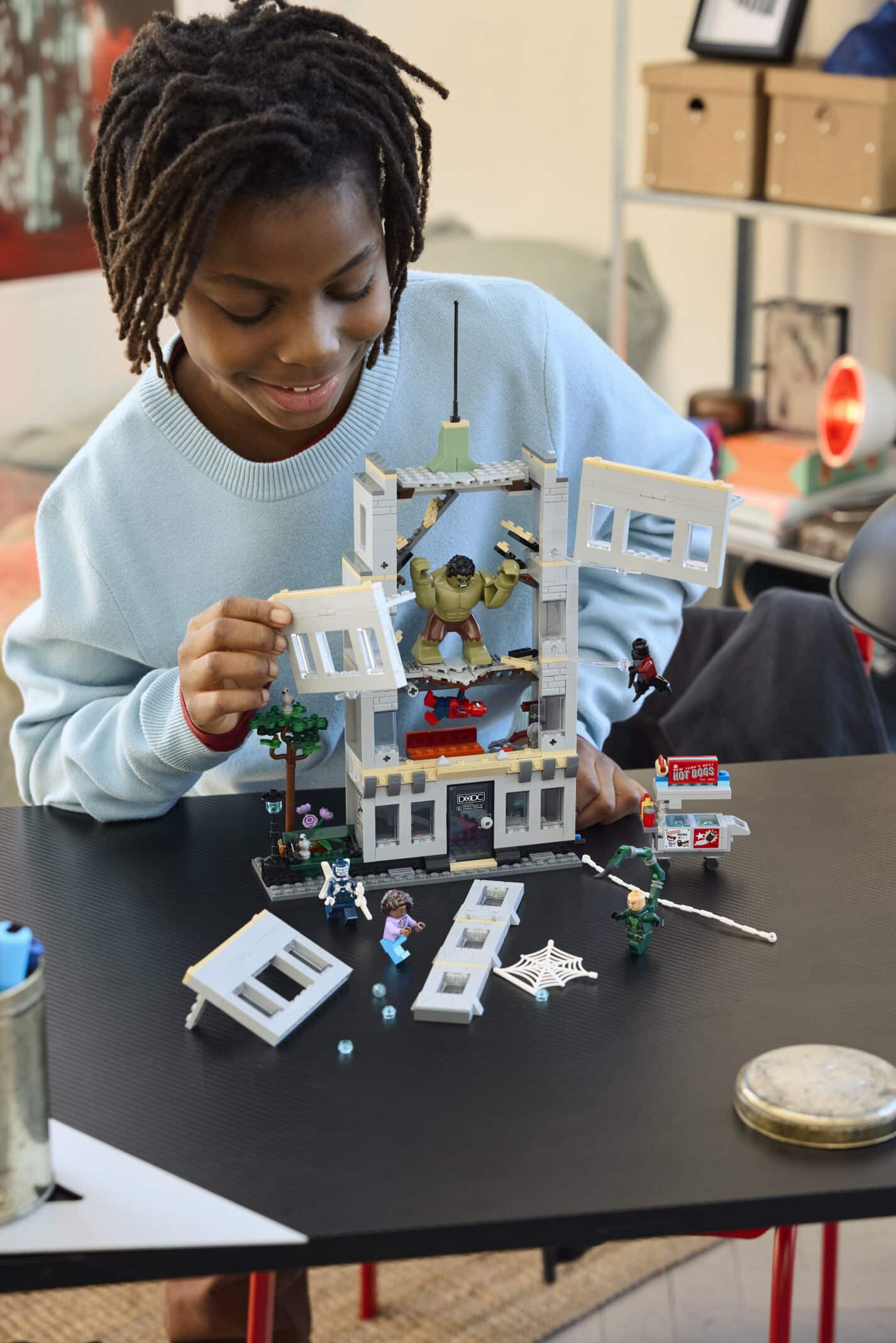 Swing into action as Spider-Man leaps around the towering office building to dodge Tarantula, Scorpion and Boomerang’s attacks. Then Hulk smashes the building into pieces! Grab a snack from the hotdog cart before battle commences! And with Build Together mode in the LEGO® Builder app, your friends and family can join in the creative fun.