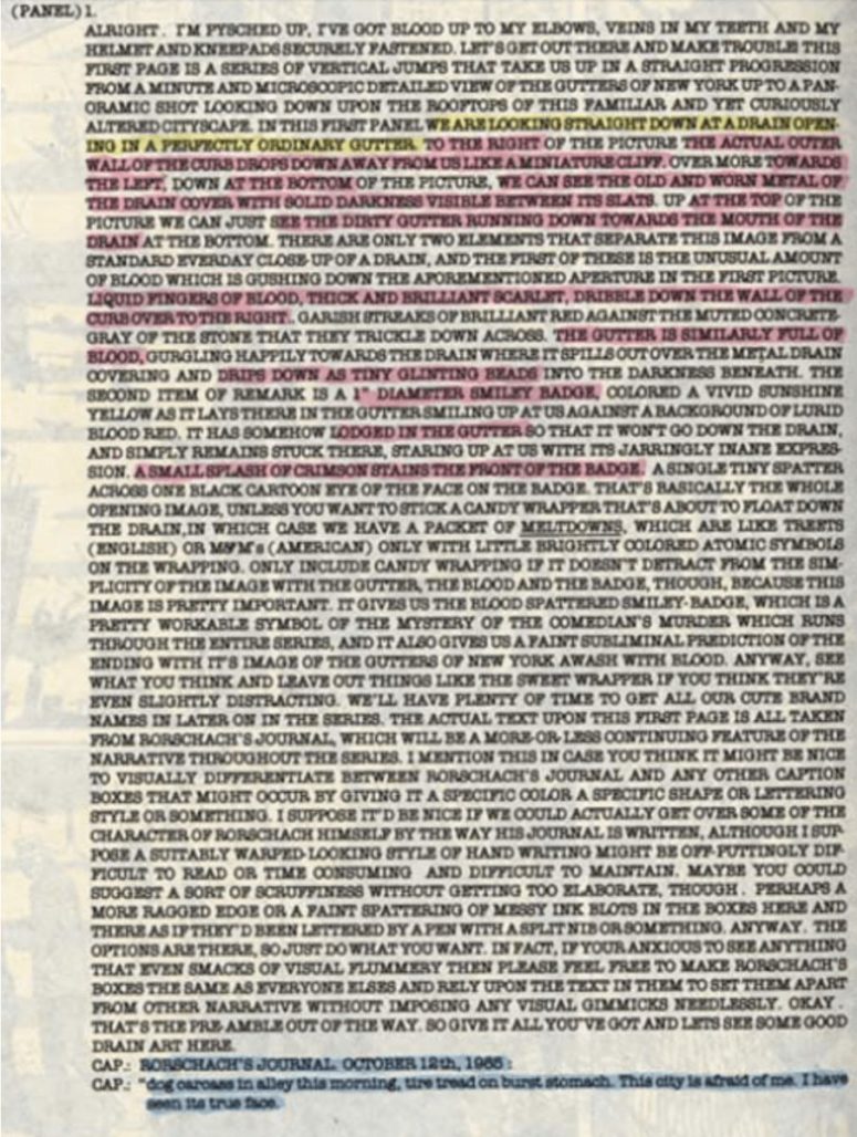 Scripts with long, hyper-specific descriptions are largely unnecessary and frustrating for the artist. Everyone mentions Alan Moore’s very detailed scripts, but it’s important to point out that many artists identify what they need to draw and essentially ignore the rest. See how Dave Gibbons highlighted what was relevant in Moore’s description of Page 1, Panel 1 of Watchmen.