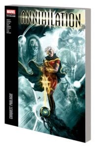 In the grim aftermath of the Annihilation War, a devastated universe struggles to rebuild. Gripped by fear and paranoia, civilizations have collapsed, and entire worlds are now smoking ruins. What’s next for the battle-weary hero known as Nova? What are Ronan’s plans for the once-mighty Kree Empire? And now that Peter Quill is once again Star-Lord, which cosmic characters will join his ragtag crew to guard the galaxy? Meanwhile, the new Quasar – Phyla-Vell, daughter of Captain Marvel – embarks on an epic journey, but what has happened to her home world? What classic foe of the Avengers is now hunting her? And what is troubling her lover, Moondragon? All the while, a devastating threat looms that threatens conquest – and annihilation! Collecting ANNIHILATION: CONQUEST PROLOGUE (2007) #1, ANNIHILATION: CONQUEST – QUASAR (2007) #1-4, ANNIHILATION: CONQUEST – STARLORD (2007) #1-4 and ANNIHILATION SAGA (2007).