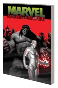 Some of the most scarily talented creators in comics line up to haunt your favorite heroes and villains, including the iconic vampire hunter Blade! Among the nightmares the Daywalker will face are a bloodthirsty and heretofore forgotten Queen of Monsters! Plus: a heart- (and bone-) breaking tale of the brotherly love between Thor and Loki – or what’s left of him! The resurrection of the Hit-Monkey’s hitman! Doctor Strange at the mercy of a spell so malevolent even the Master of the Mystic Arts can’t control it! Also featuring senses-shattering stories featuring Iron Man, the Punisher, the classic Defenders and more! All rendered in black, white and blood red – more frightening than ever on the oversized pages of a Treasury Edition! Collecting MARVEL: BLACK, WHITE & BLOOD AND GUTS (2025) #1-4.