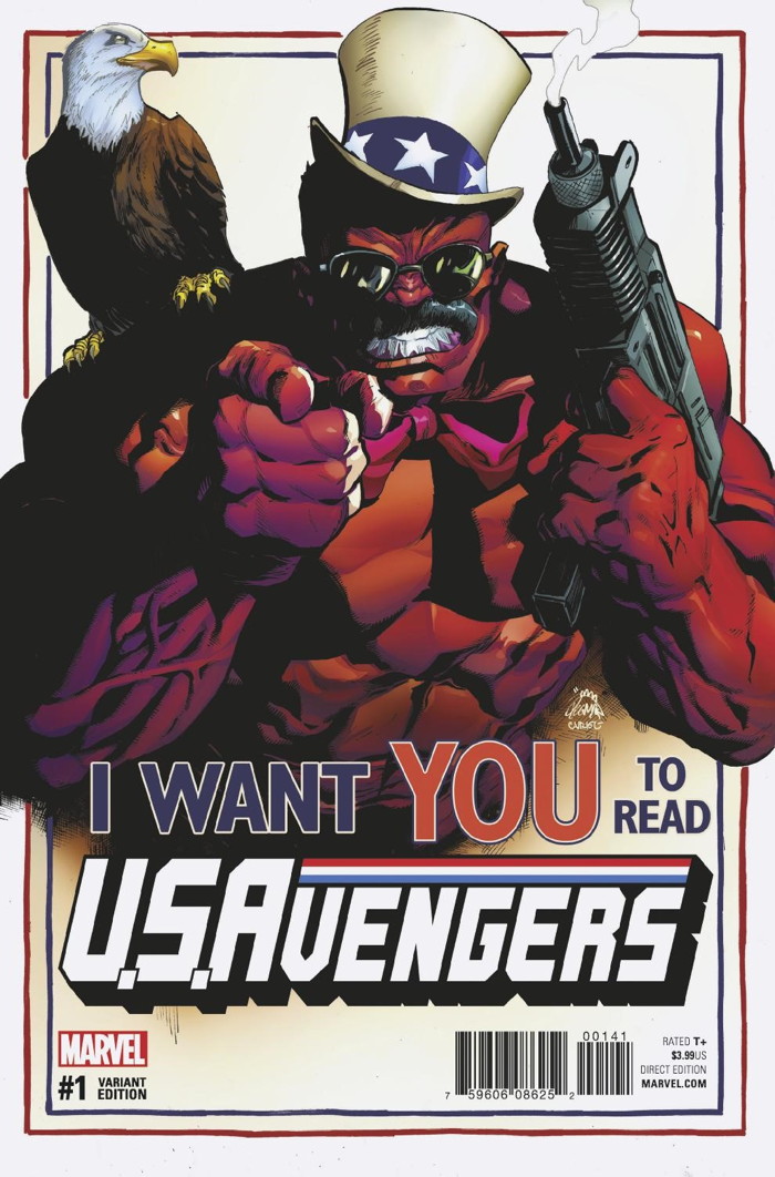 Prepare yourselves for the coming of…AMERICAN INTELLIGENCE MECHANICS! Now operating as part of the U.S. Government, A.I.M. will dare any danger – no matter how awesome it may be. They’ll fight the good fight to protect their nation from the weirdest, wildest, threats around. Sunspot, Cannonball, Iron Patriot, Enigma, Captain America 20XX, Squirrel Girl and the Red Hulk – the most patriotic super-group of them all is here and they’re ready to save the day. And you better believe they’ll do it all looking tried and true in the red, white and blue! Are you ready? Can you handle…the U.S.Avengers? Don’t miss one moment of the high-octane action when this can’t-miss new series debuts on January 4th in U.S.AVENGERS #1!