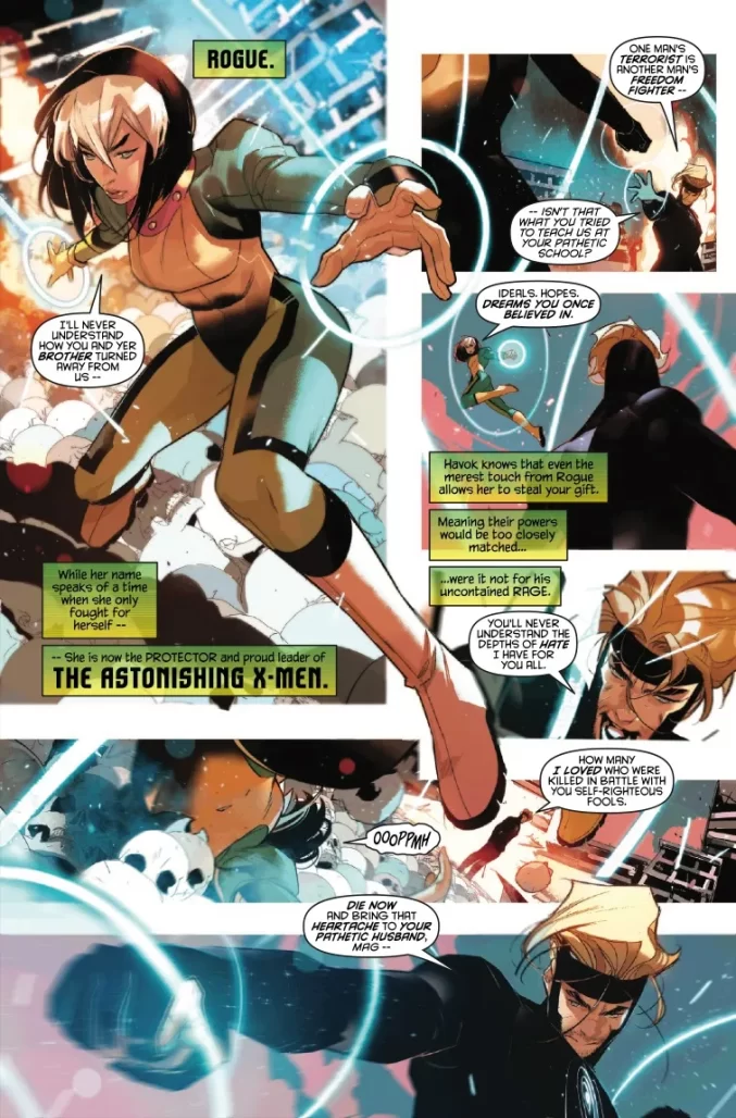 Writing characters in broad strokes can be an effective when paired with an interesting plot or twists but we don’t see either of these. The plot revolves around restoring the AoA timeline as the correct timeline and the X-men of Apocalypse questioning why they didn’t die in the nuclear holocaust. I don’t like to review the book I wish I read instead of what I read, but I can’t help but wonder how much better this comic would have been if it tried answering the later question instead.