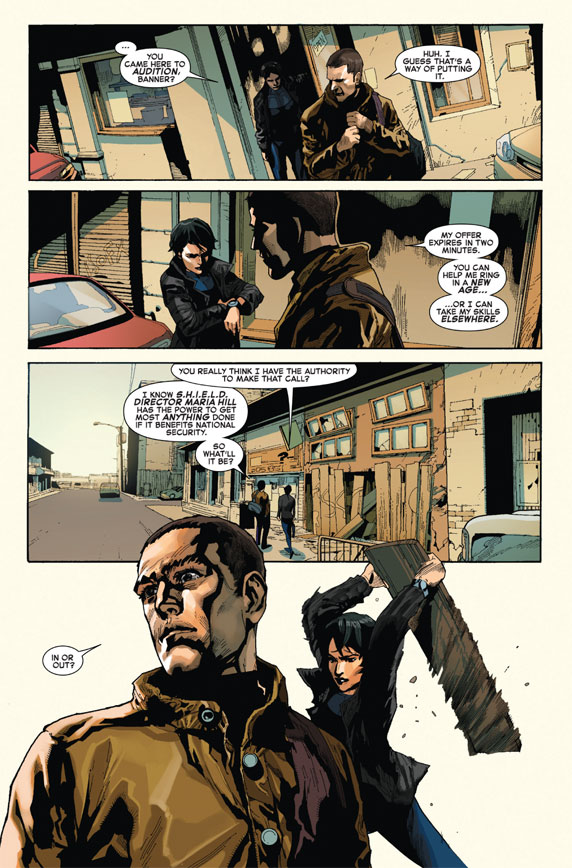 A lot of the Hulk’s personality comes from how angry Banner was at the time he changes. So sometimes he transforms and has the more talkative personality which Brian Michael Bendis has often used. And sometimes he’s more like the film version of the character, violent and non-verbal. This is where SHIELD come into play. Their job will be to point Hulk in the right direction, and let him go. He’s a cannon, not a bomb.