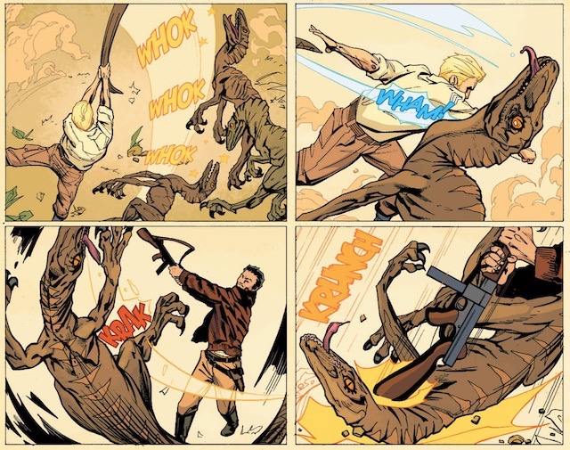 Jordie infused them with a real immediacy and urgency that made those sequences sing. It felt like the way she slightly offset those harsh, stark colours made the pages almost vibrate with energy. Shows you exactly what a good colourist can bring to the table; an end product that you just don’t see coming, but wonder how the hell you didn’t come up with yourself in the first place. Cracking stuff, on her part.