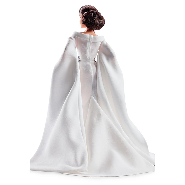 The three dolls are: Princess Leia, R2-D2, and Darth Vader. Rather than directly replicate the characters and their costumes from the movie, Mattel’s Star Wars x Barbie line features high-fashion versions of each. However, key components of these iconic looks are still present, like Leia’s space buns and Vader’s cape.
