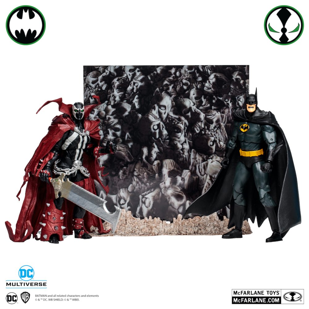 Along with the figures, the Batman & Spawn two-pack will feature a special backdrop featuring artwork of the two characters by Todd McFarlane on one side, and a landscape adorned with dozens of skulls on the other side, as well as a base for the backdrop. Figure stands, trading cards featuring McFarlane artwork, and numerous accessories round out the set.
