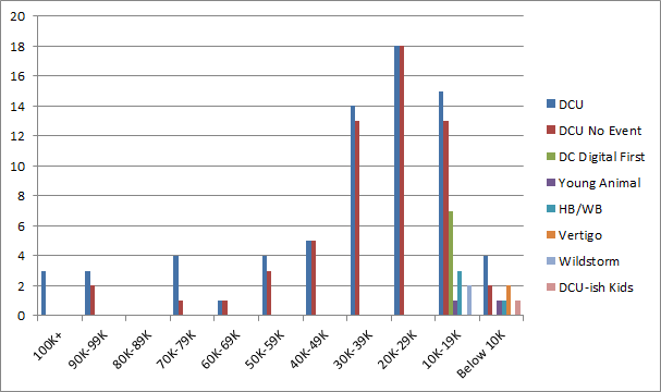 When taken as a whole, the DC chart doesn’t look too bad. Only one sales band (80K-89K) is empty of titles. Multiple books selling over 100K. An equal number in the 90Ks range as over 100K.