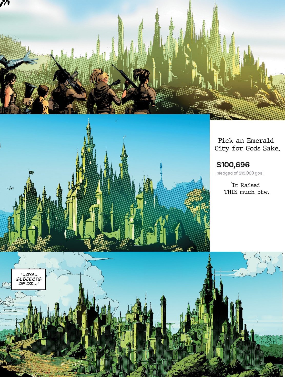In his thread, Northridge points out side-by-side panels where the Tin Man has a completely different design, as well as panels where the Emerald City is shown with three totally different skylines, moving windows, and textures.