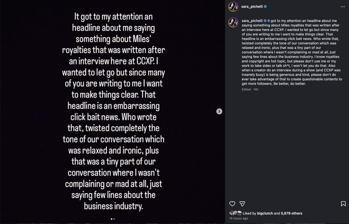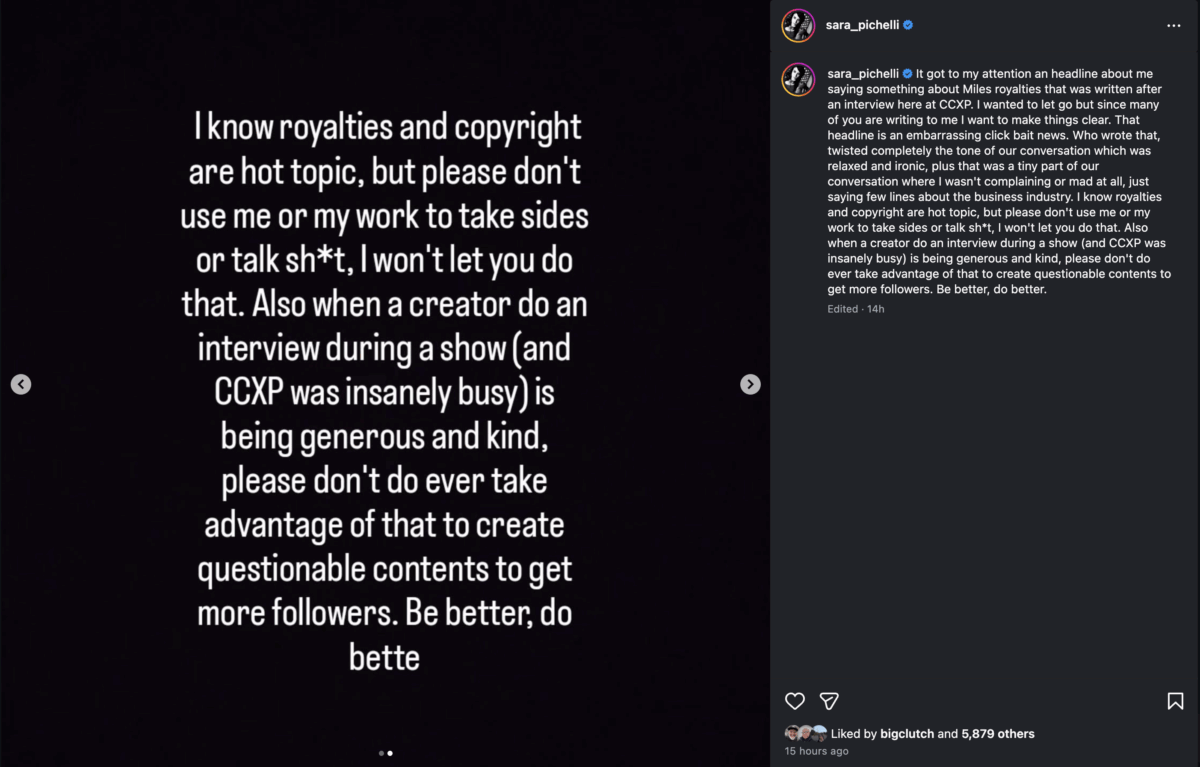 It got to my attention a headline about me saying something about Miles’ royalties that was written after an interview here at CCXP. I wanted to let go, but since many of you are writing to me, I want to make things clear. That headline is an embarrassing clickbait news. Who wrote that, twisted completely the tone of our conversation, which was relaxed and ironic, plus that was a tiny part of our conversation where I wasn’t complaining or mad at all, just saying a few lines about the business industry. I know royalties and copyright are hot topics, but please don’t use me or my work to take sides or talk sh*t, I won’t let you do that. Also, when a creator does an interview during a show (and CCXP was insanely busy) are being generous and kind, please don’t ever take advantage of that to create questionable content to get more followers. Be better, do better.