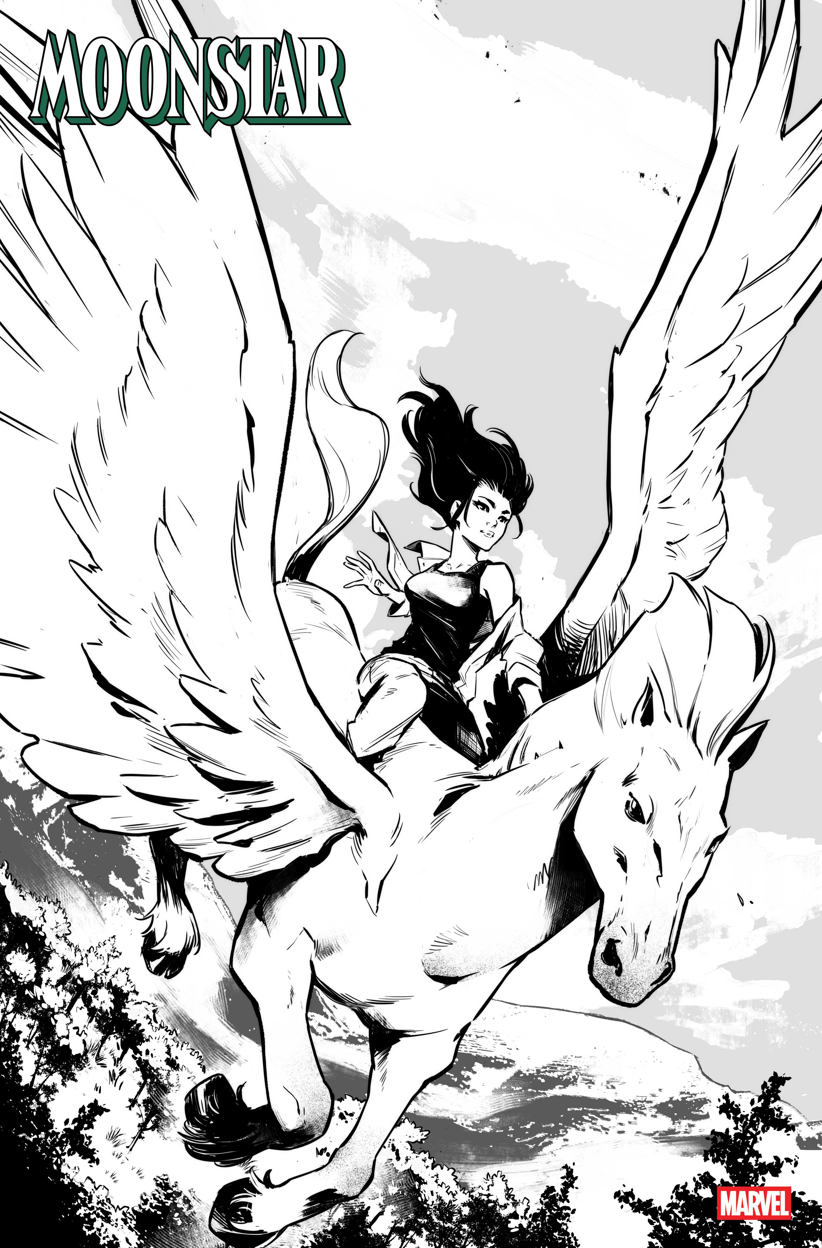 Moonstar #1 will be released on March 4, with a main cover by Allen’s main Magik collaborator German Peralta, as well as variants by Joshua “Sway” Swaby, Marcos Martin, and Dani’s co-creator Bob McLeod. You can check those out along with an uncolored interior preview page below.