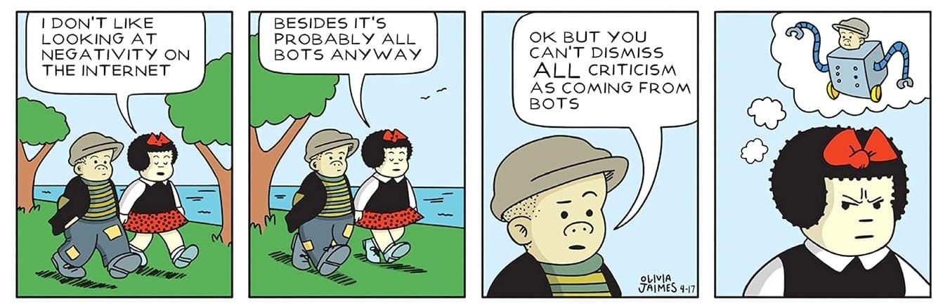 Olivia Jaimes is a pseudonymous cartoonist who took over the Nancy comic strip in 2018, following the retirement of Guy Gilchrist after a 22-year run. The first female cartoonist to take on the character in her ninety-year history, Jaimes has brought the strip to new heights with an award winning run that preserved the core DNA of the strip whilst bringing it into the modern age.