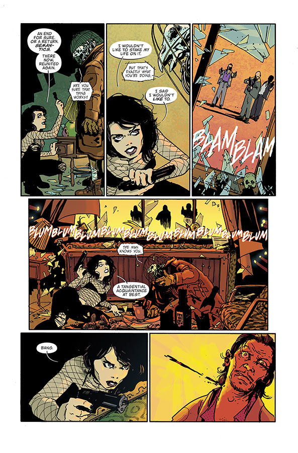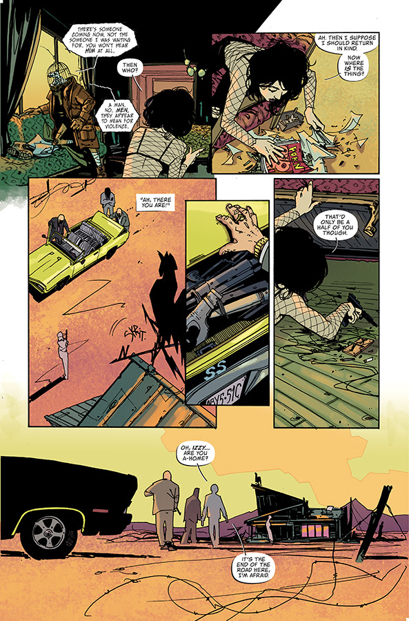 Coffin Bound is a book all about the inevitability of death, and the choice each of us faces between coming to terms with it, or trying to deny it. This is a book drawn beautifully by Dani, with Brad Simpsons’ filthy bright colors. This is a book about cars, guns, and sex—and how each of those things does little to stave off the bottomless void waiting just beyond the veil of our known existence. What was the question again?