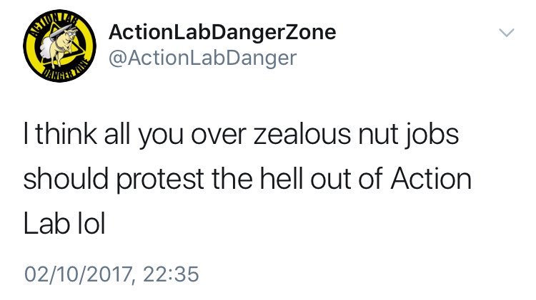 “I would like to apologize on behalf of Action Lab and Action Lab Danger Zone for any and all rude and inappropriate tweets. We do not believe these tweets where done by any Action Lab staff but by a malicious third party. Passwords have now been changed and tweets deleted but damage has already been done and again we apologize.”