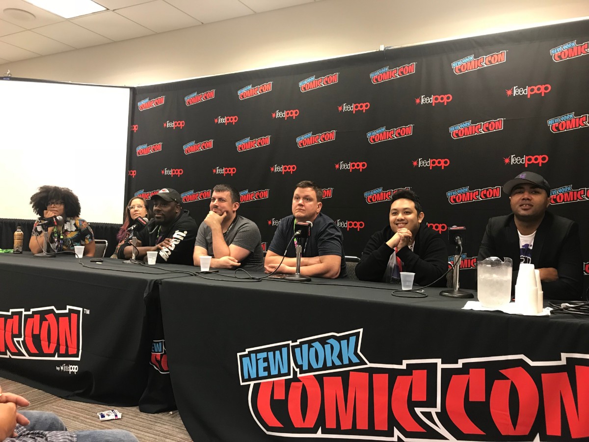 Ayala’s candor opened the floor for fellow Black Mask creators Kwanza Osajyefo (Black, Black AF), Fabian Lelay (We Are the Danger, Jade Street Protection Services), Eric Palicki (No Angel), Joe Corallo (editor, Oh S#!t It’s Kim & Kim), Tony Patrick (X’ed), and Liana Kangas (artist, Black AF: Devil’s Dye) to discuss the work they do in creator-owned comics and how it differs from the mainstream. They also talked about how telling the stories they want to tell can lead to real-life danger from people who aren’t as interested in what they have to say.