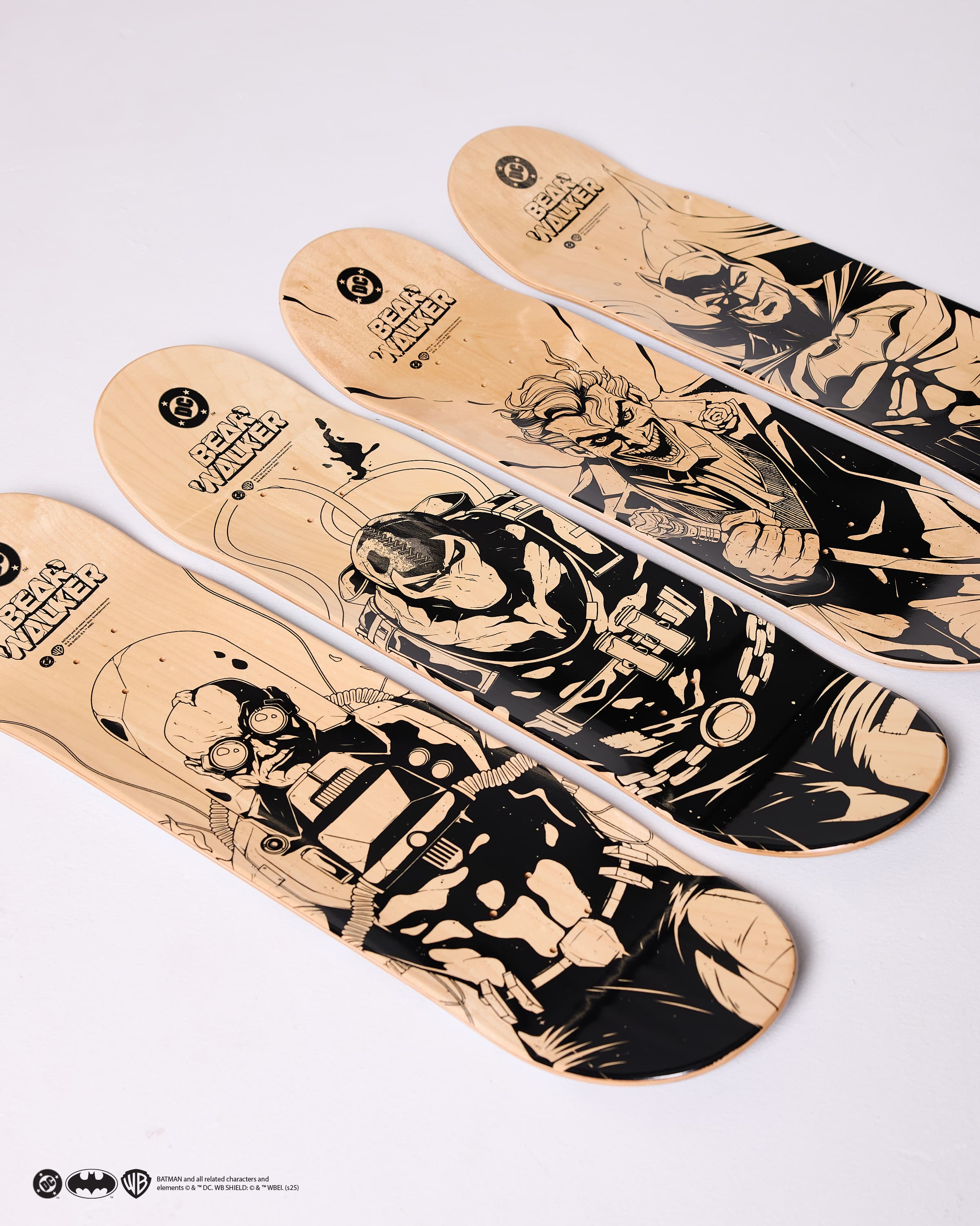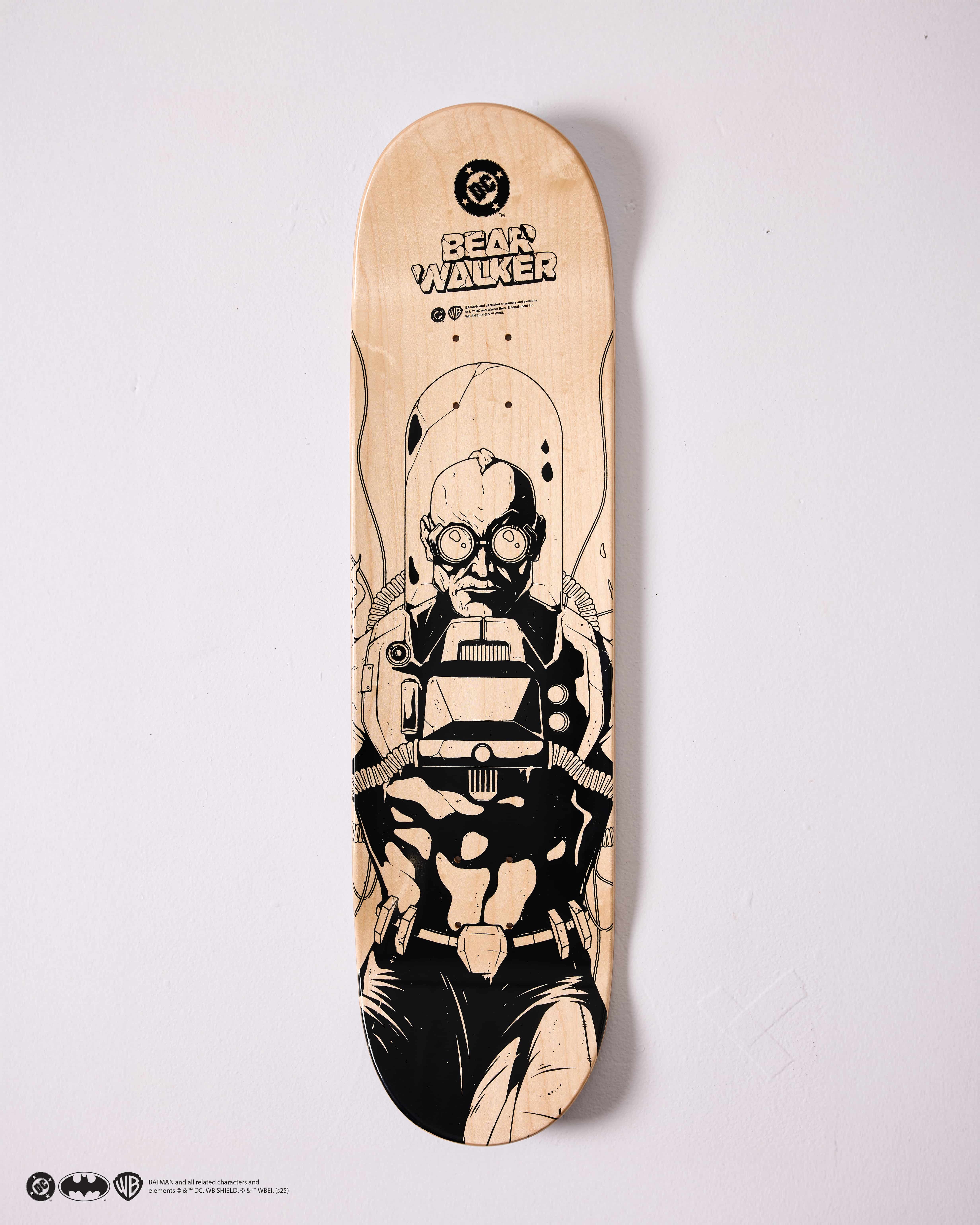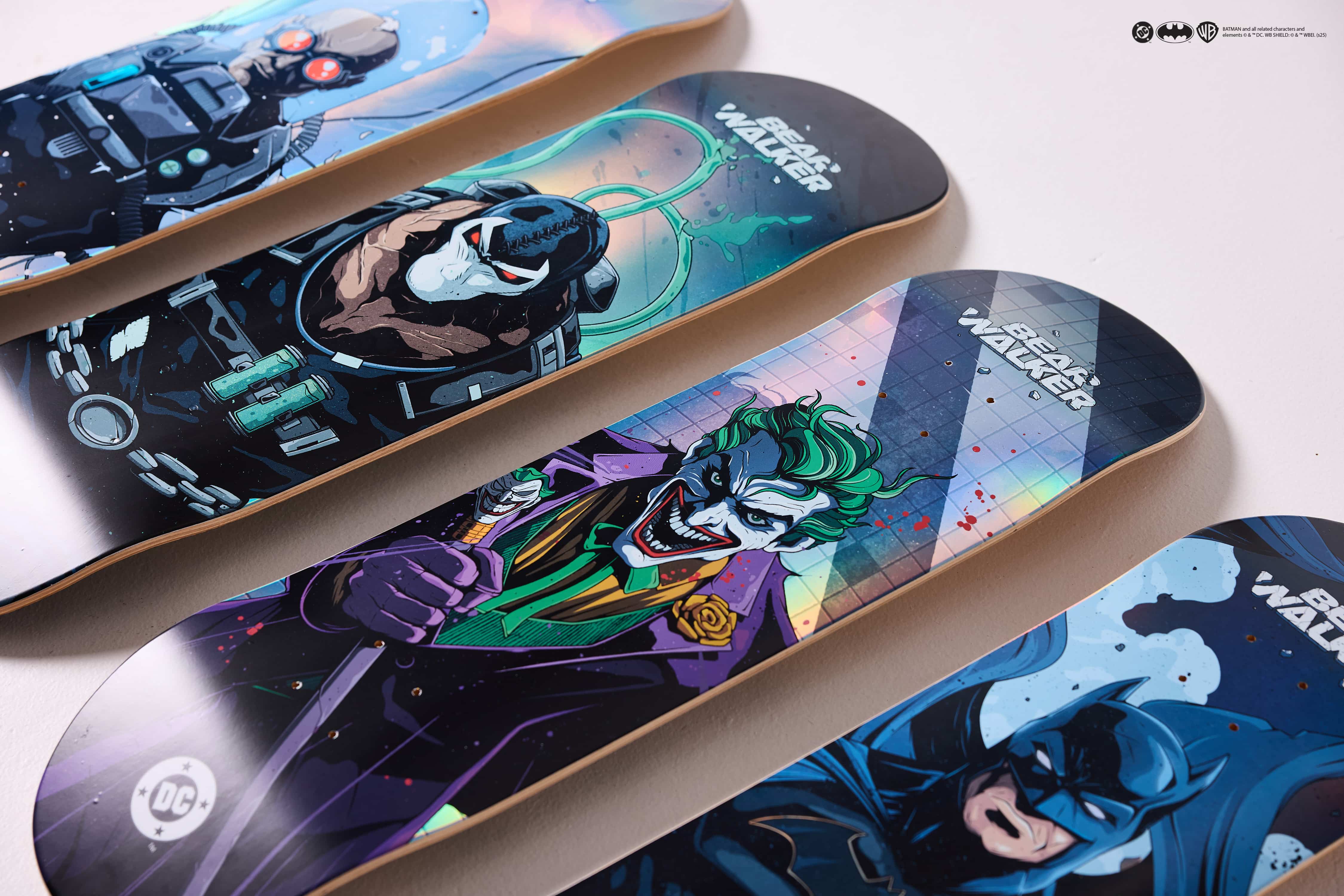 Meanwhile, the DC Comics series includes four boards themed around iconic villains and heroes: Batman, the Joker, Mr. Freeze, and Bane. Each deck displays a monochrome outline of the character on the top side, contrasted by a vibrant, full-color illustration on the bottom, enhanced with an iridescent finish. All retail for $96.