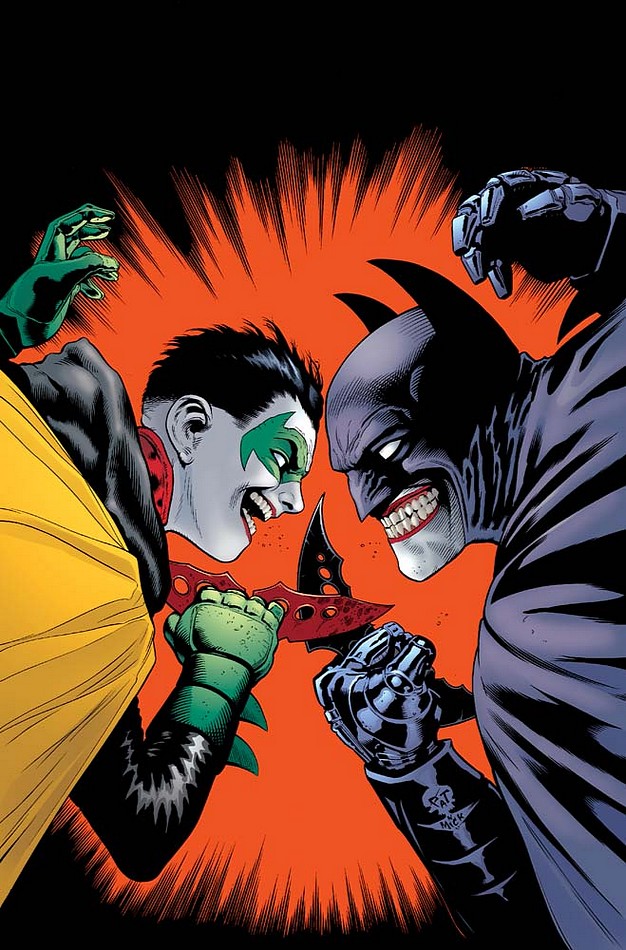 The cover for Batman & Robin’s tie-in to ‘Death of the Family’ is part of a trend of covers which appear to reveal what Joker’s plan is going to be. If he can’t have his own face, then everybody else will have it for him!