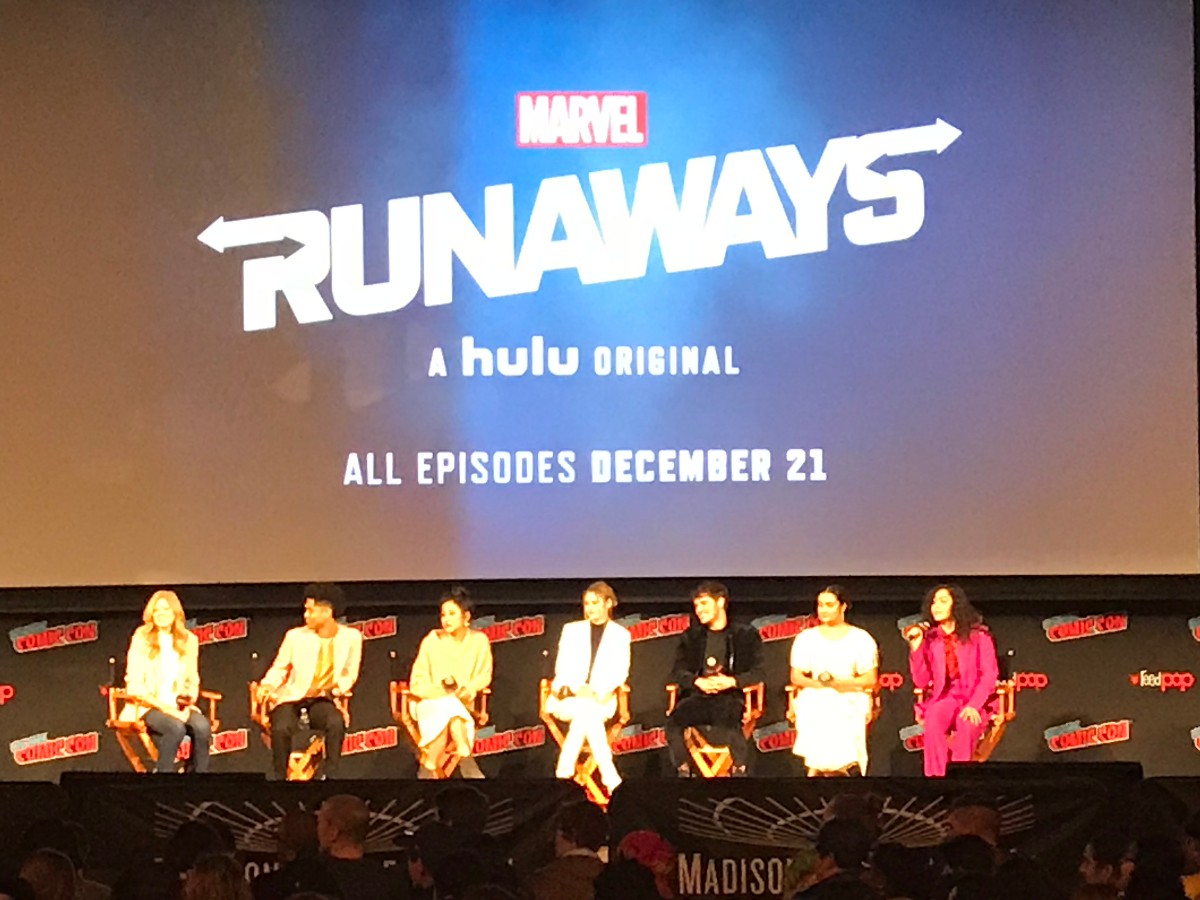 Moderated by Executive Producer Jeph Loeb, the Runaways panel at NYCC hit the ground, well, running, with producer Stephanie Savage and castmembers Rhenzy Feliz (Alex Wilder), Lyrica Okano (Nico Minoru), Virginia Gardner (Karolina Dean), Ariela Barer (Gert Yorkes), Gregg Sulkin (Chase Stein) and Allegra Acosta (Molly Hernandez) all present and accounted-for.