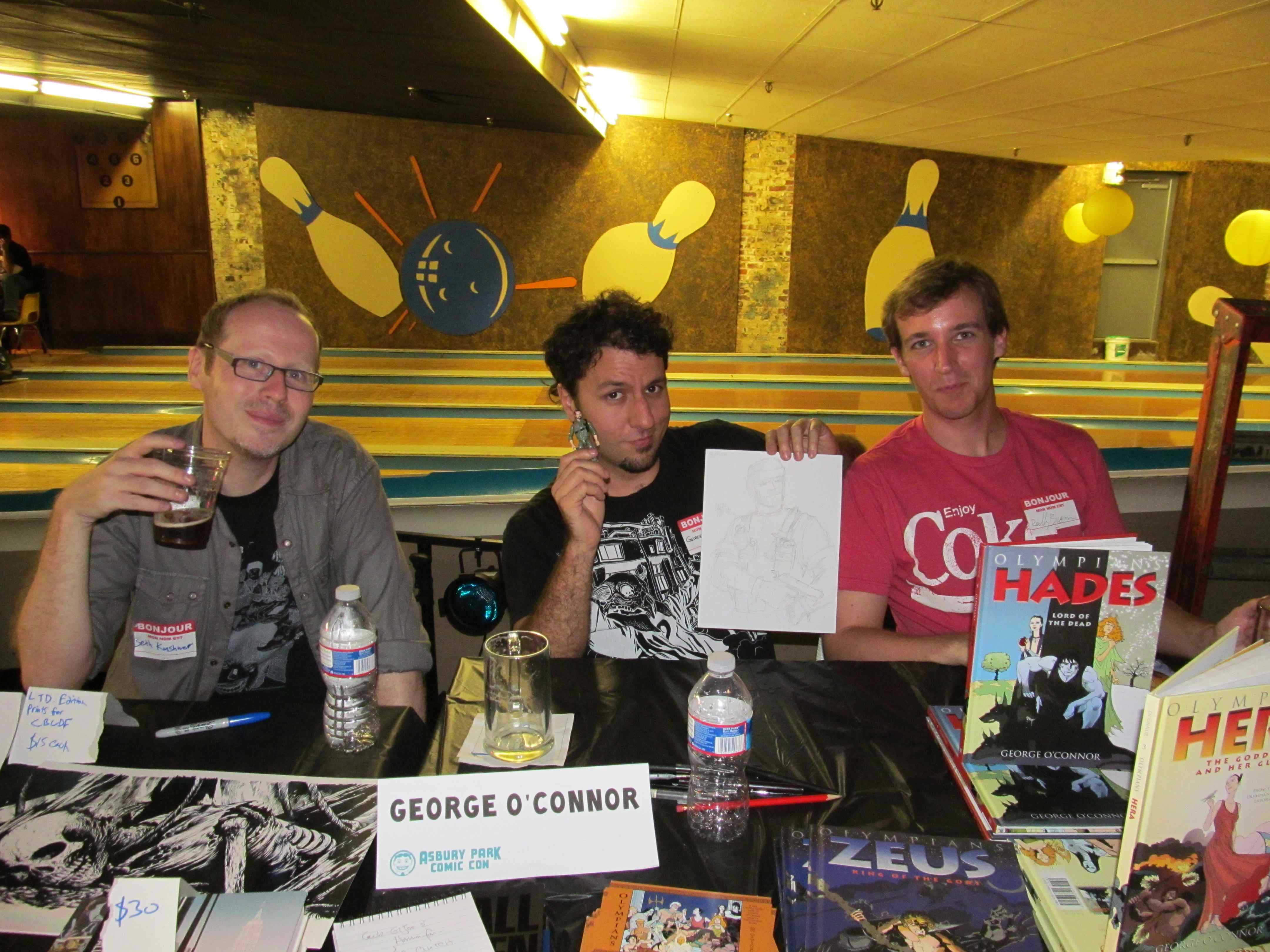 A first-time contingent of New Yorkers flanked the sound stage at the Lanes, including Dean Haspiel (BILLY DOGMA, CUBA MY REVOLUTION), Seth Kushner (THE SCHMUCK DIARIES), George O’Connor (HADES), and Reilly Brown (POWER PLAY). The group came out to Asbury on the basis of its creator-focused vibe and the good things they had heard about the first Asbury Con. Haspiel and Kushner, who co-curate the online literary arts salon TRIP CITY brought mini comics with and like many of the writers and artists at APCC represented only one degree of removal from production to sales. O’Connor and Brown, like Haspiel, have worked in mainstream comics as well as on their own, and have carved out reputations based on an impressive work ethic and high-quality art. O’Connor has a range of successes as a picture-book artist, but has also completed three of a planned twelve book series from First Second on each of the Olympian gods from Greek Mythology.