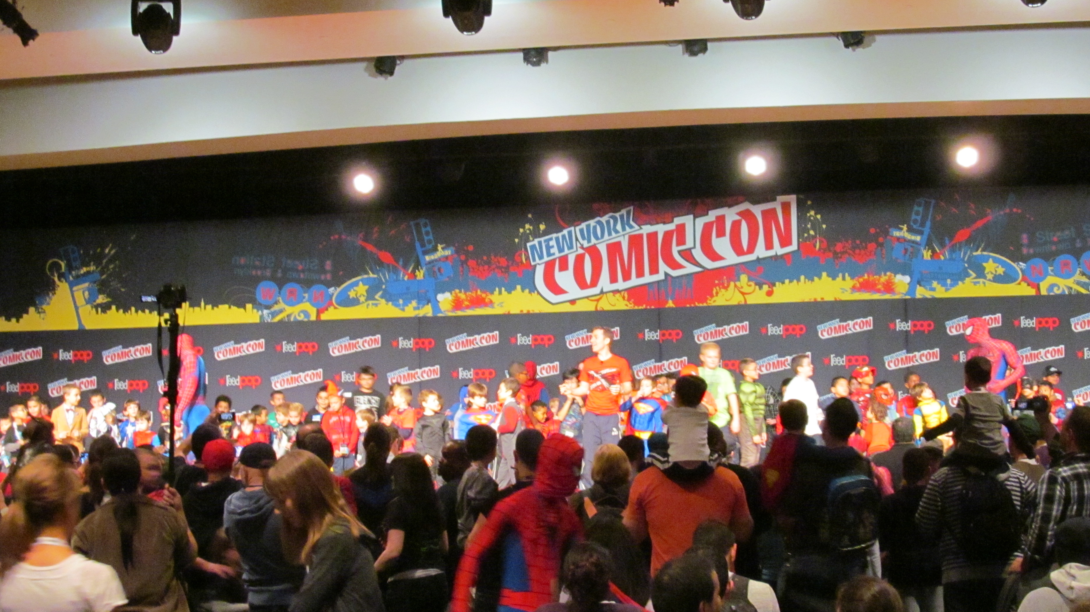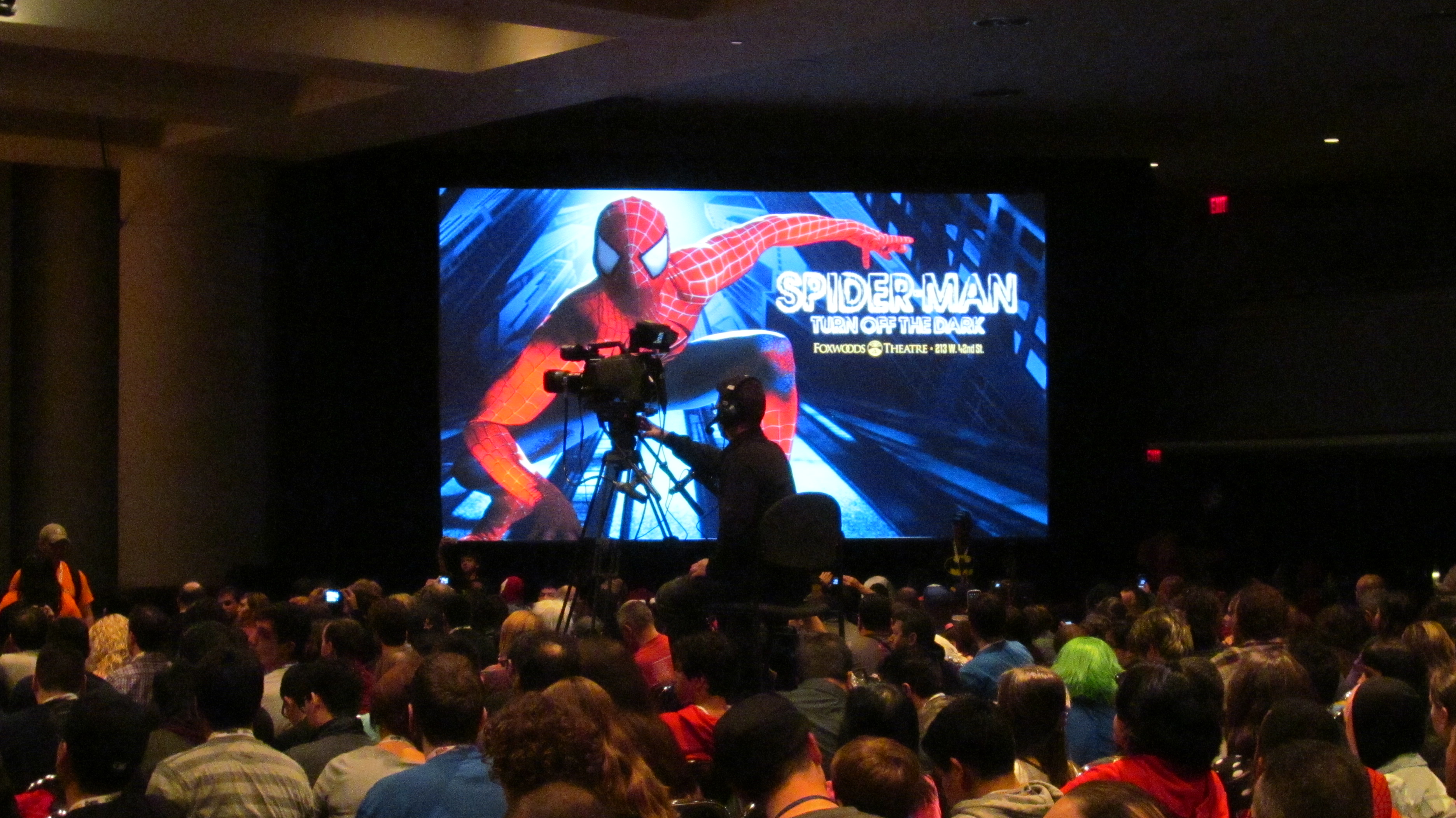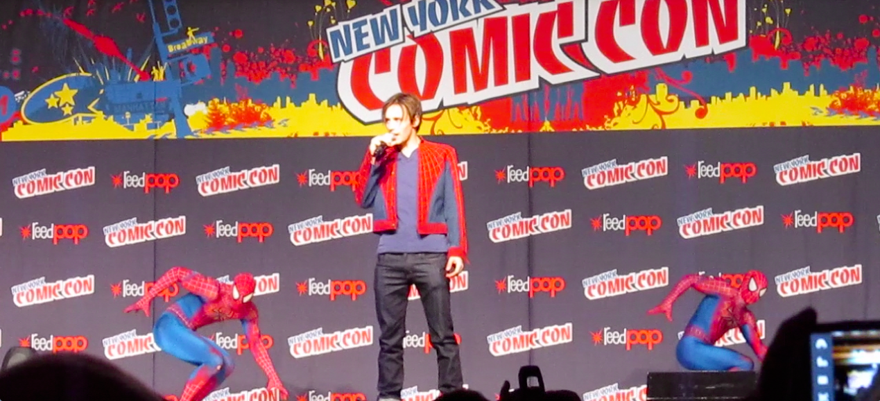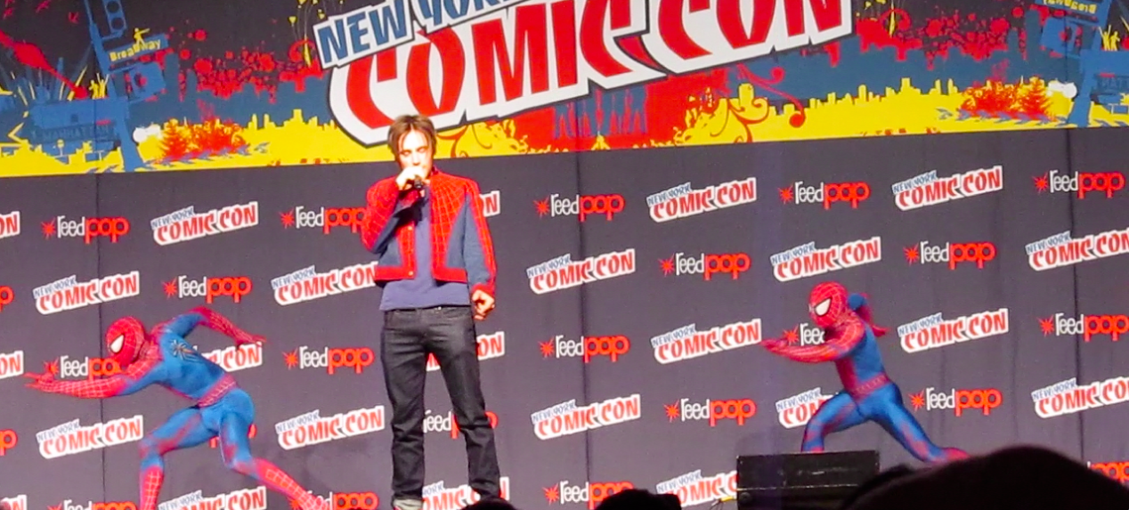 It wouldn’t have been appropriate to hold a New York Comic Con this year without acknowledging the 50th birthday of Marvel’s flagship hero, and there was plenty of merchandise on hand from the con to commemorate it, including a tote bag, t-shirt, and sweatshirt. But Sunday’s birthday celebration was designed to be kid-inclusive while wowing the parents who brought them along. And what’s a party without costumes? All the better that at least half came in Spidey-appropriate gear to hear a live performance by the Broadway musical TURN OFF THE DARK’S Reeve Carney and see some of the choreography from the show. The IGN theatre hosted the event and the tykes trooped in to see the spectacle. Resident Director of the musical, David Ruttura, introduced clips from the show’s production history before Carney gave a strong vocal performance of “Boy Falls from the Sky”, one of the signature pieces from the musical written by Bono and The Edge of U2 fame, complete with three Spider-man back up dancers.