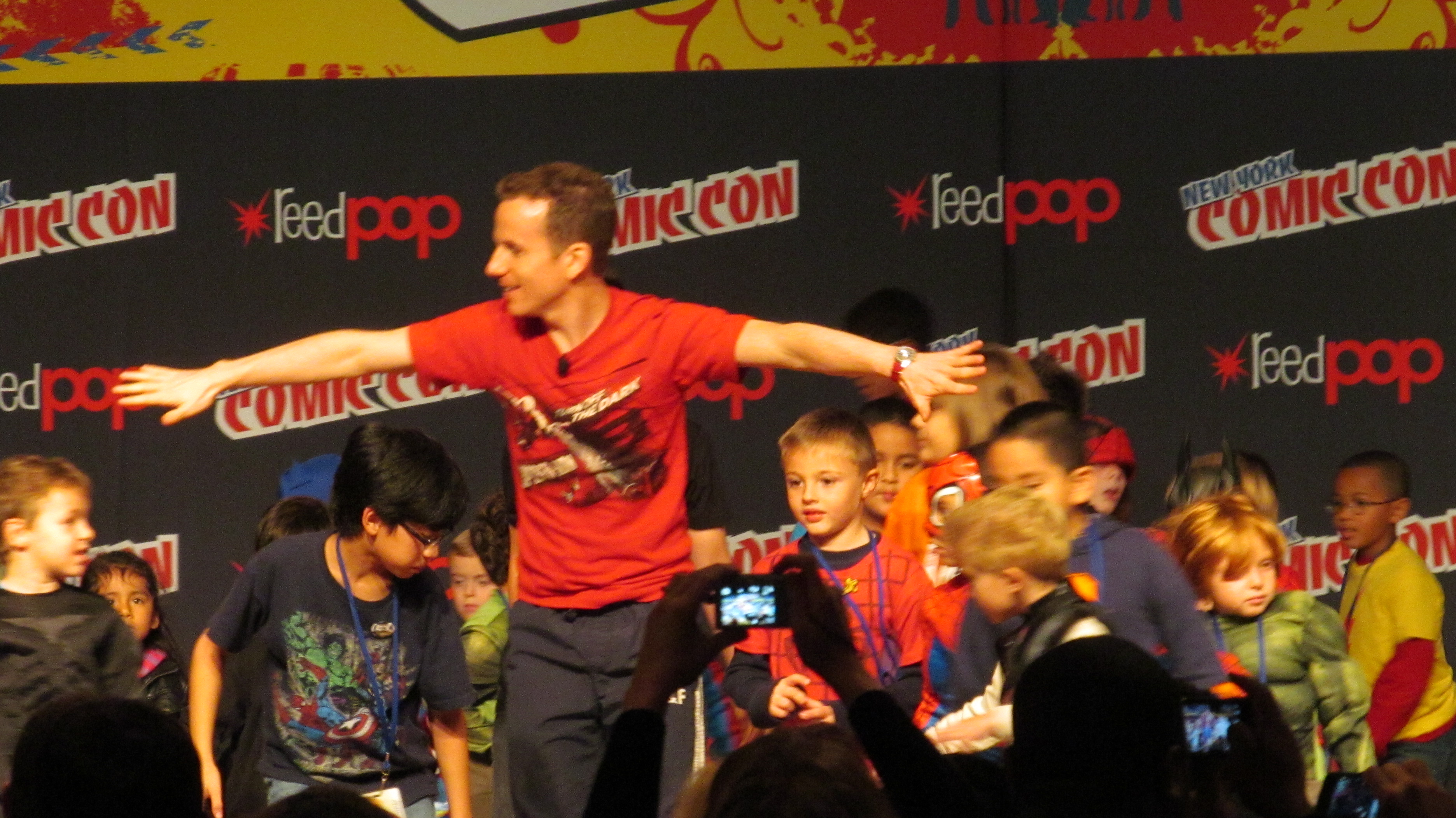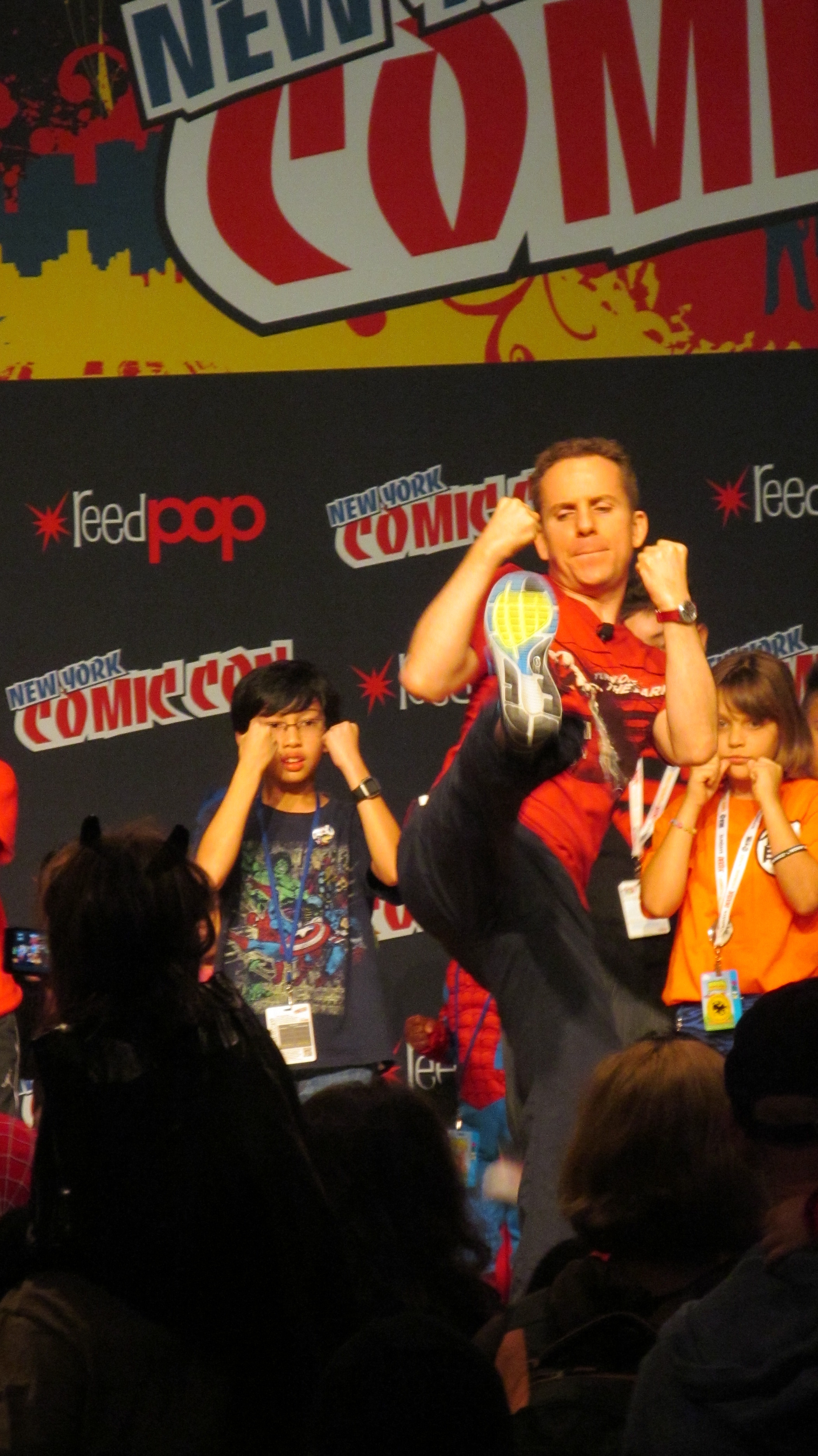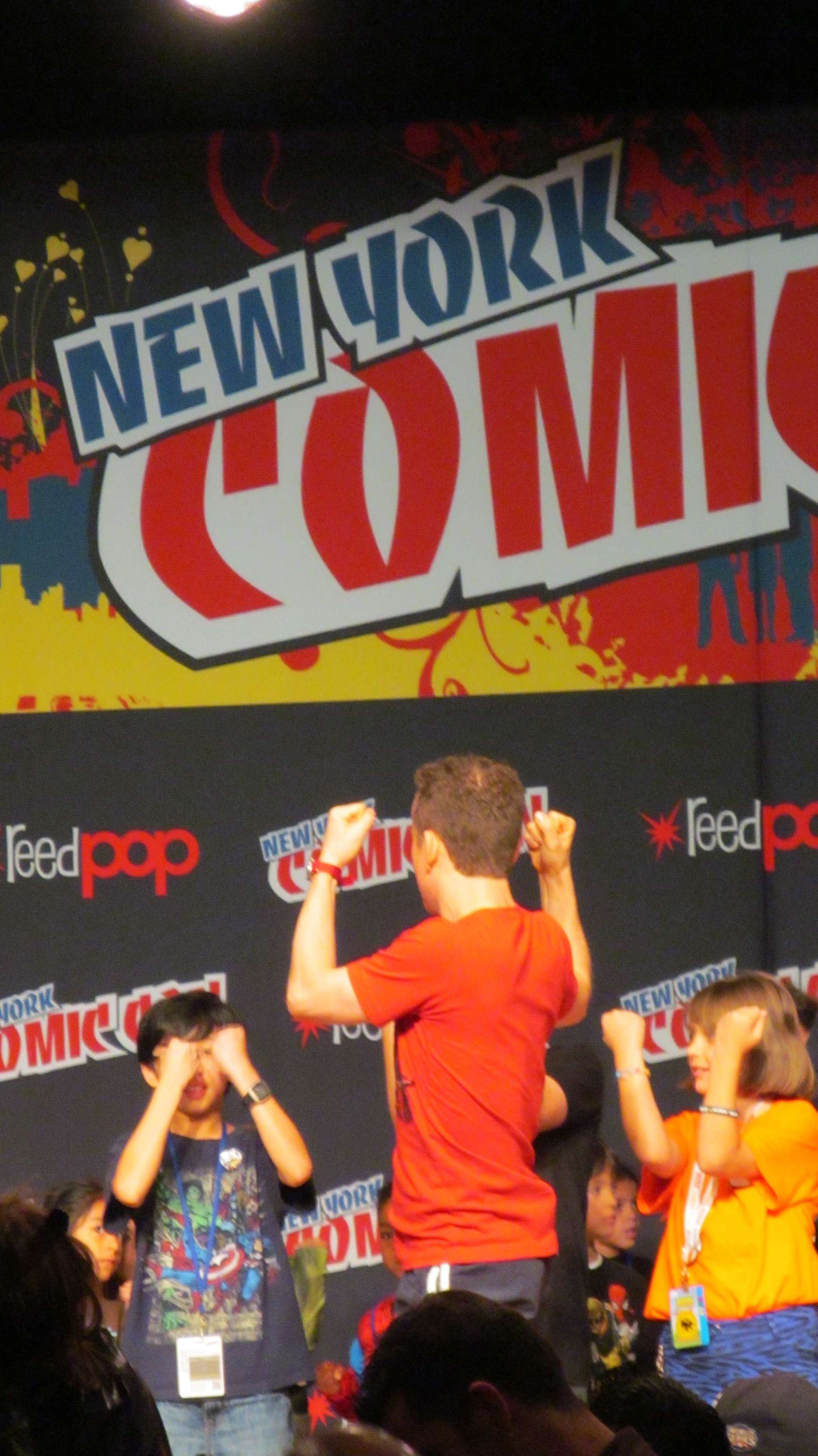 It wouldn’t have been appropriate to hold a New York Comic Con this year without acknowledging the 50th birthday of Marvel’s flagship hero, and there was plenty of merchandise on hand from the con to commemorate it, including a tote bag, t-shirt, and sweatshirt. But Sunday’s birthday celebration was designed to be kid-inclusive while wowing the parents who brought them along. And what’s a party without costumes? All the better that at least half came in Spidey-appropriate gear to hear a live performance by the Broadway musical TURN OFF THE DARK’S Reeve Carney and see some of the choreography from the show. The IGN theatre hosted the event and the tykes trooped in to see the spectacle. Resident Director of the musical, David Ruttura, introduced clips from the show’s production history before Carney gave a strong vocal performance of “Boy Falls from the Sky”, one of the signature pieces from the musical written by Bono and The Edge of U2 fame, complete with three Spider-man back up dancers.