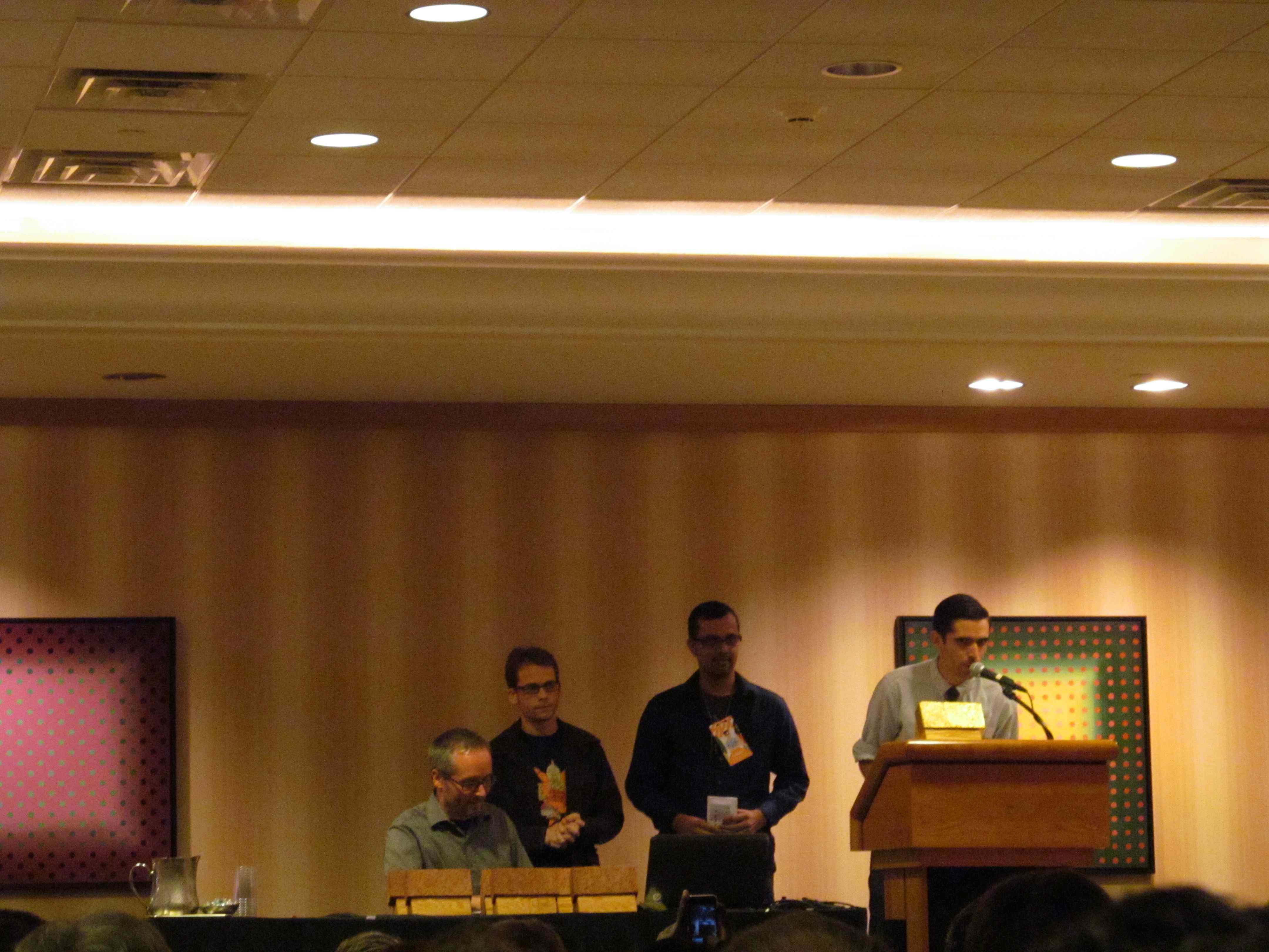 The award for “Outstanding Story” was presented by John Green who reminded us that comics creating is one of the few professions where you can “do it without pants” and the fact that you can “manage to make all these comics without wearing any pants” is remarkable. The category was thronged with worthies, but went to “Return to Me”, from LOVE AND ROCKETS NEW STORIES #4, by Jaime Hernandez and published by Fantagraphics. Jaime thanked voters for “breaking a perfect record of no awards this year”. The presence of the Hernandez brothers at SPX this year brought a great deal of energy, and often hilarity, and the Ignatz awards were no exception.