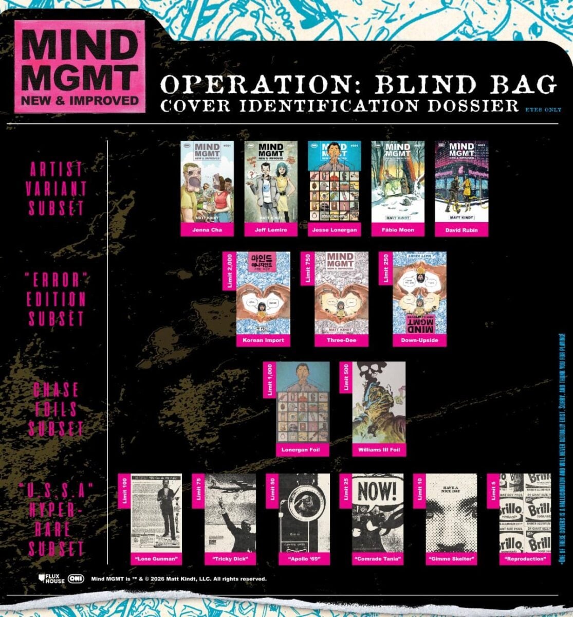 The full Oni Press solicitations shipping in June 2026 have been released by the publisher. This month sees the return of Matt Kindt‘s MIND MGMT with previews for some of the covers in Operation: Blind Bag, Marceline and Princess Bubblegum make a new mixtape to celebrate their anniversary in Adventure Time Pride Special: PB & Marcy’s Infinite Mixtape #1 and we survive the dangerous streets of 2125 London in Destination Kill #2.