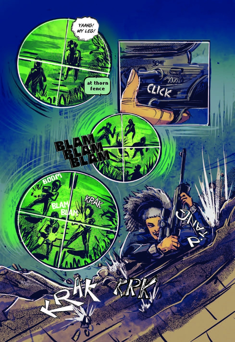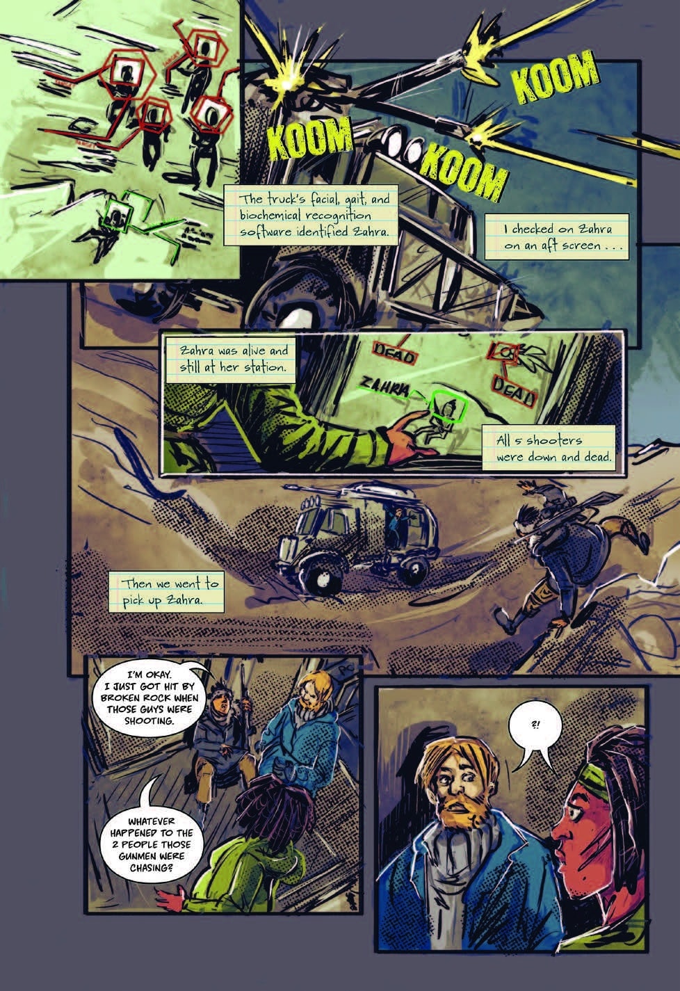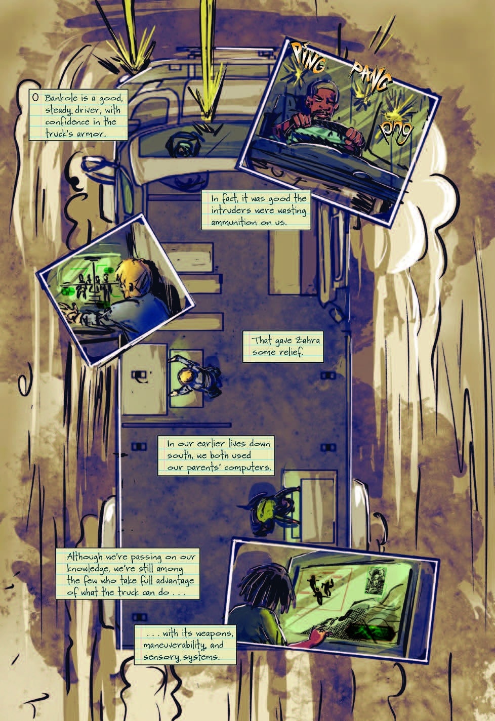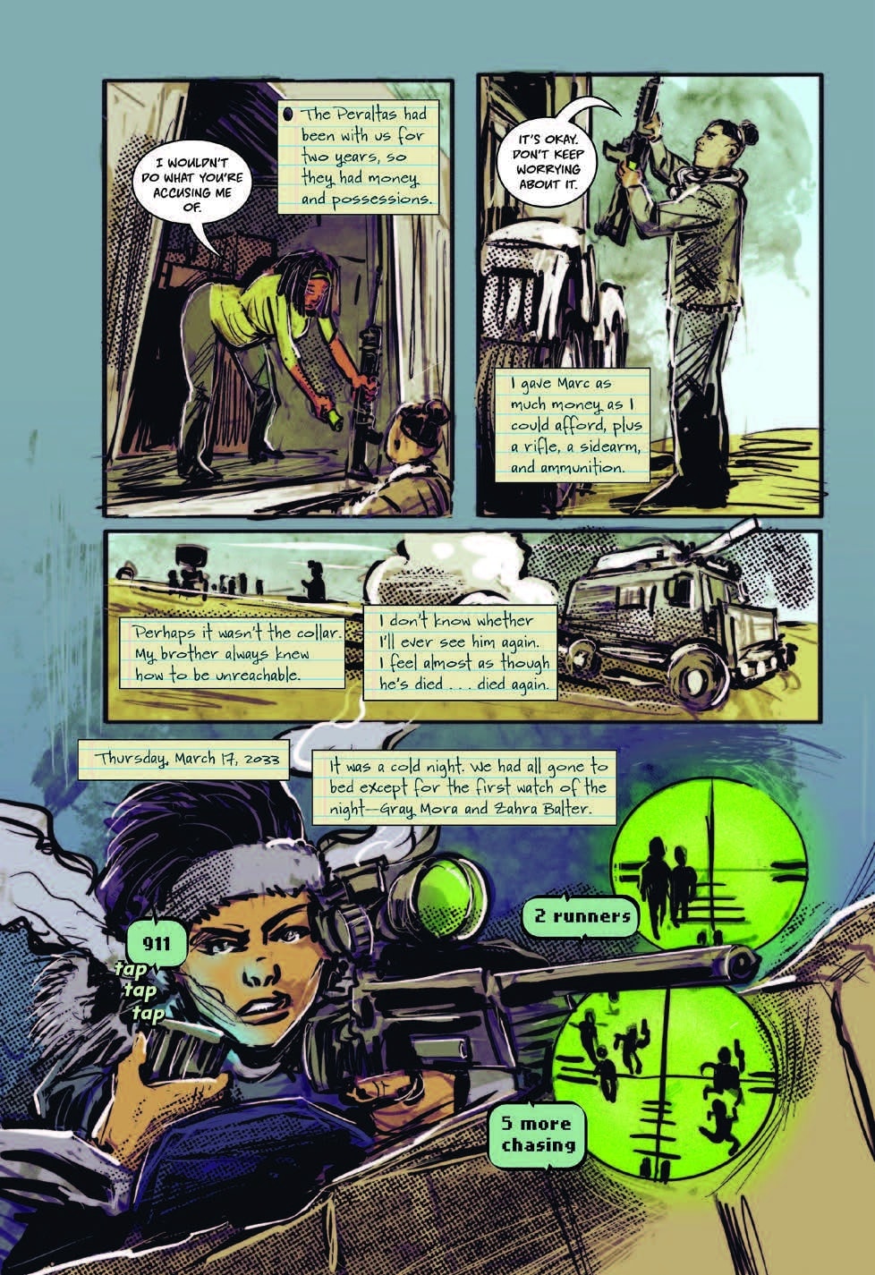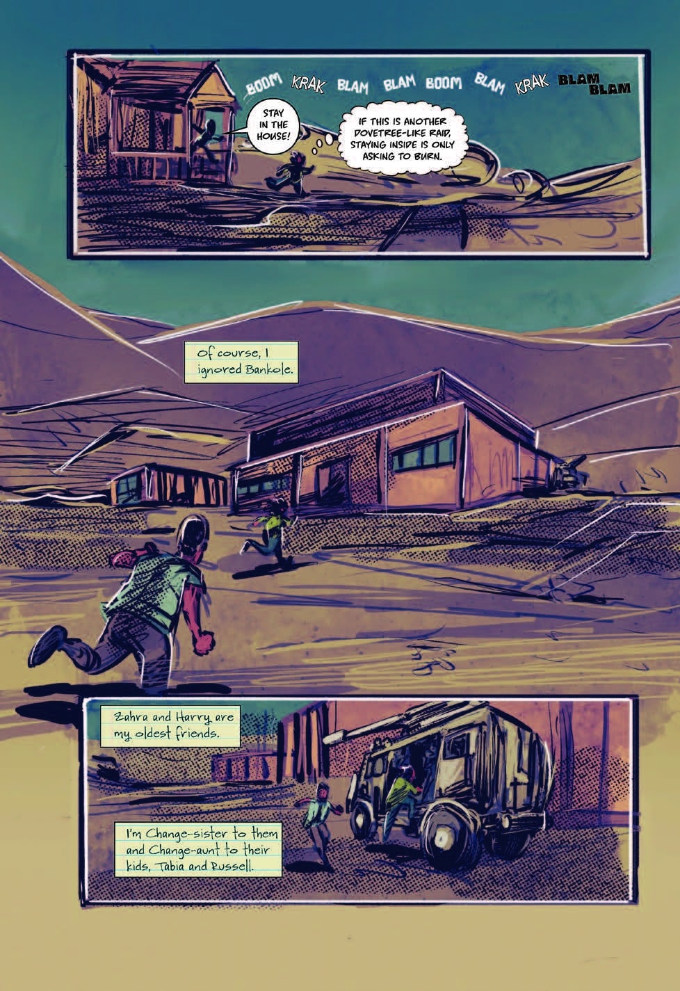 Reviewing the split color pallets gives each narrative a visual voice. Larkin/Asha has a brighter look that fits her futuristic POV, while Olamina’s world is colored with more subdued earthy colors or intense dark swatches to convey the situation. Olamina’s pallet shifts are used when her world shifts, like the destruction of Acorn, her search for Larkin, or the expansion of Earthseed.