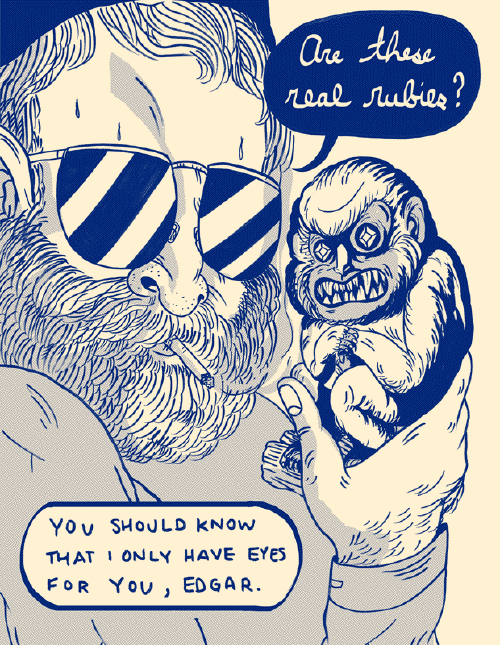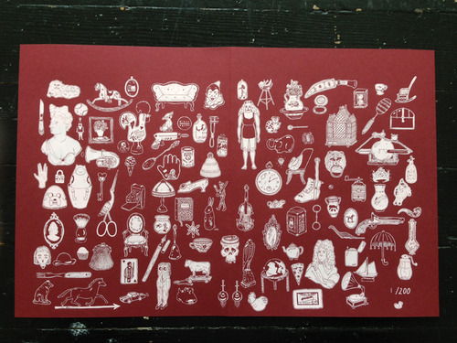 With ANTIQUES ROADSHOW, Collective Stench member Allison Dubois has edited and published a 200 edition anthology showcasing a beautiful silkscreened cover as well as risographed interior, printed at Mission Risoplex with the help of another stellar newcomer to indie publishing, Youth In Decline’s Ryan Sands. The contributor list for ANTIQUES ROADSHOW reads like a complementary juxtaposition of many differing styles and aesthetics, ranging from the crisp brush lines of Roman Muradov to the severe and in-your-face inking of Niv Bavarsky, all of whom create a fresh and distorted envisioning that transcends the classic program’s simple hunt for valued relics of bygone times.