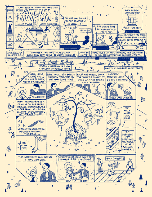 The countdown to CAKE is looming down to mere hours away and as can be expected, there seems to be an impressive blitz of debuts lined up. One release that could possibly be a shining star is ANTIQUES ROADSHOW, an anthology put together by Collective Stench’s Allison Dubois. A compilation of some of San Francisco’s most gifted indie cartoonists, this 52-page omnibus breathes new life into the wacky weirdness and demented oddities behind the beloved PBS program of the same name.