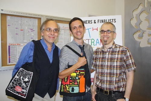 A few event photos from around. Christina Foxley from The Strand bookstore sent us a few photos of the exhibit of the Strand Tote Bag design contest which was held the other night at SVA. Above, left to right: Toon Books Françoise Mouly, runner up Domitille Collardey, cartoonist and contest judge Art Spiegelman; another judge, R. Sikoryak; runner-up Tim Goldman and winner Zak Foster. We stopped by and ran into many cartoon types, including Sarah Glidden who told us about her next project after the upcoming HOW TO UNDERSTAND ISRAEL IN 60 DAYS OR LESS, another comics-journalism piece, and it sounds pretty interesting. Collardey is what you call “an emerging cartoon star” and she’s presently working on a graphic novel to be published in France.