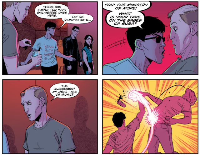 However, eventually, plot does happen. The inciting event for the mini-series occurs near the end of the issue, and at first, I was disappointed. But then I turned the page, and there was Jamie McKelvie with a chillingly pared-back sequence that manages to mine a classic 80s music video for a not-inconsiderable amount of menace. It was a weird, pop-inspired left turn that, frankly, left me a little giddy to see where they plan to take the series next. If you, like me, aren’t as well-versed in the pop music of the last few decades as you might wish, you don’t need to worry: Gillen and McKelvie’s storytelling doesn’t use its references as a crutch, but as a signpost. You may not know who the Sugababes are but you’ll know what to think of Seth by how he talks about them. It’s a tough line to walk, but Gillen does it very well.
