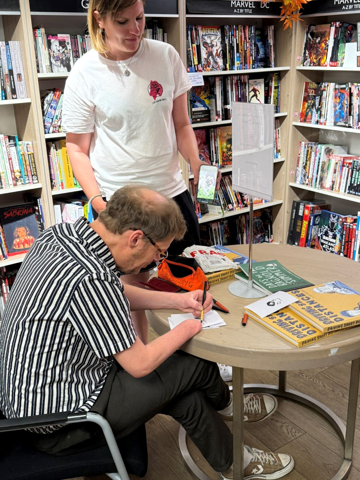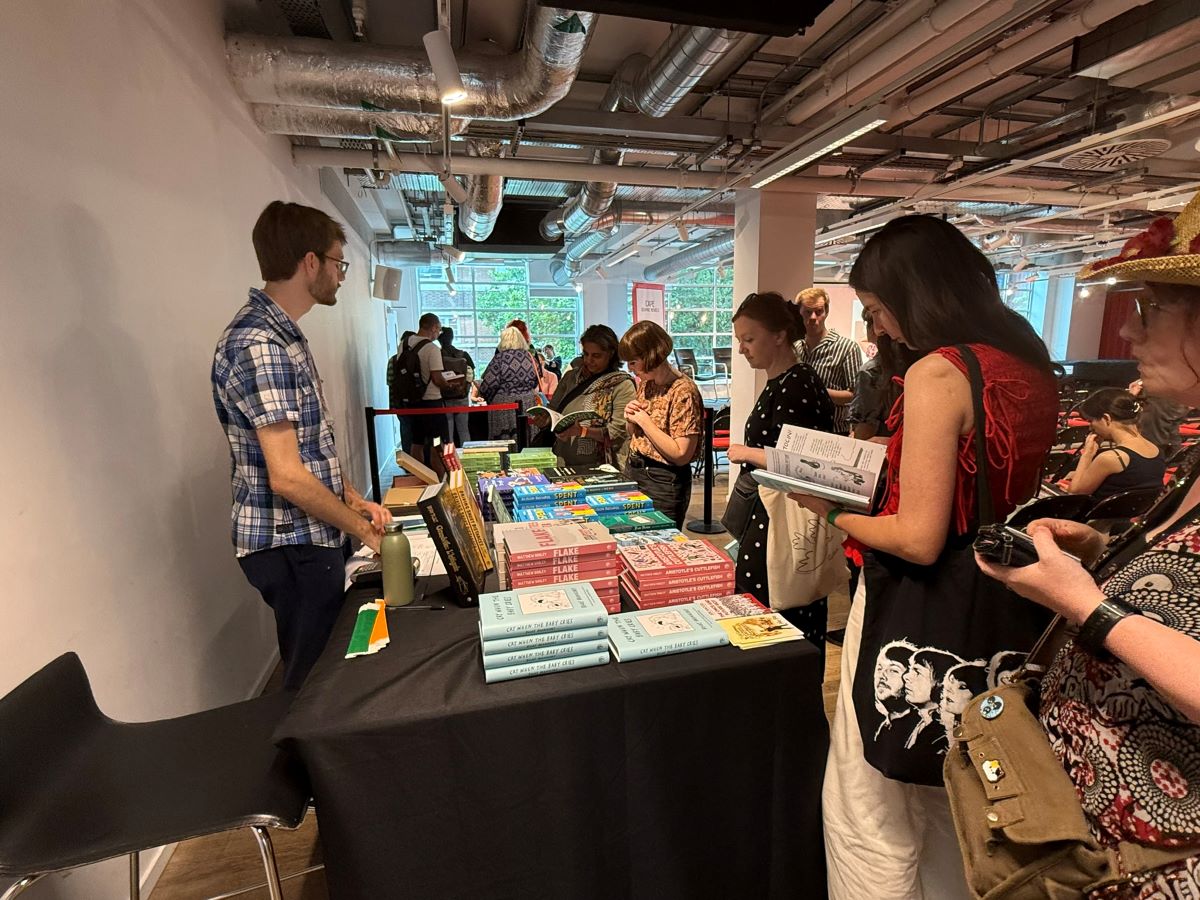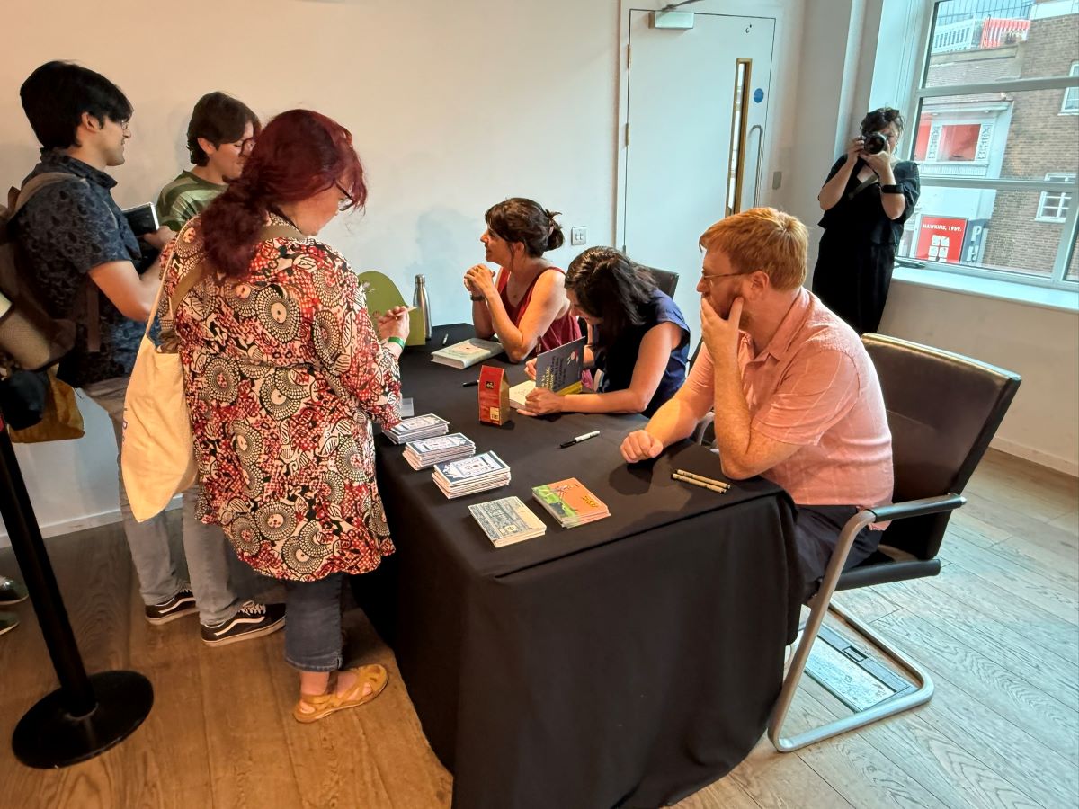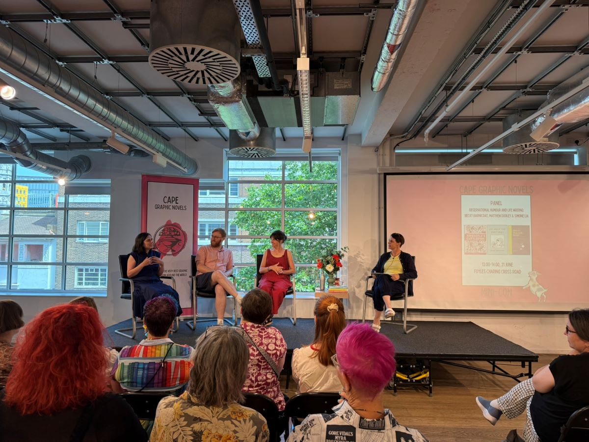 Earlier in the day, there was a pretty impressive mix of talks and signings. First was a panel – hosted by Graphic Novel Reading Room‘s Gabi Putnoki – about observational humour and life-writing featuring Becky Barnicoat (Cry When the Baby Cries), Matthew Dooley (Flake), and Simone Lia (Fluffy). Each spoke about the task of taking real-world, lived experience and finding the surreal comedy within. Barnicoat’s graphic novel adds a dose of “body horror” to the experience of becoming a parent for the first time; meanwhile, Dooley takes a familiar setting and uses it to produce sitcom-level farce, which he returns to in his latest graphic novel Aristotle’s Cuttlefish. Meanwhile, Lia brings the long-awaited sequel to her cult hit 2007 graphic novel Fluffy – about a bunny that believes he is a human child – which sees the character return and participating in the life guidance fad; it will be called How to Make Life Better When it Feels Like it’s Getting Worse. While Lia’s Fluffy sequel isn’t due for release until September, Cape Graphic Novels had a few advance copies for sale on the day (which were immediately snapped up).